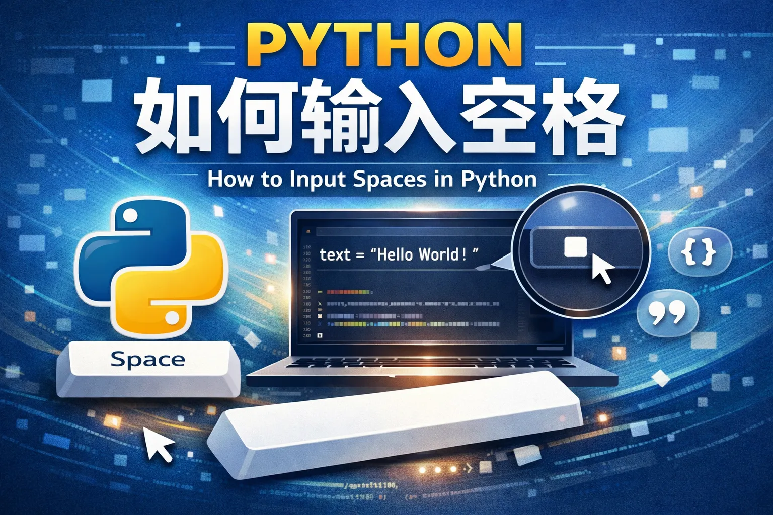 在Python中,可以直接在字符串中间输入空格,例如:"hello world"。如果需要通过变量拼接字符串并添加空格,可以使用加号操作符,如 'hello' + ' ' + 'world'。另外,格式化字符串(如f-string)也支持空格的插入。