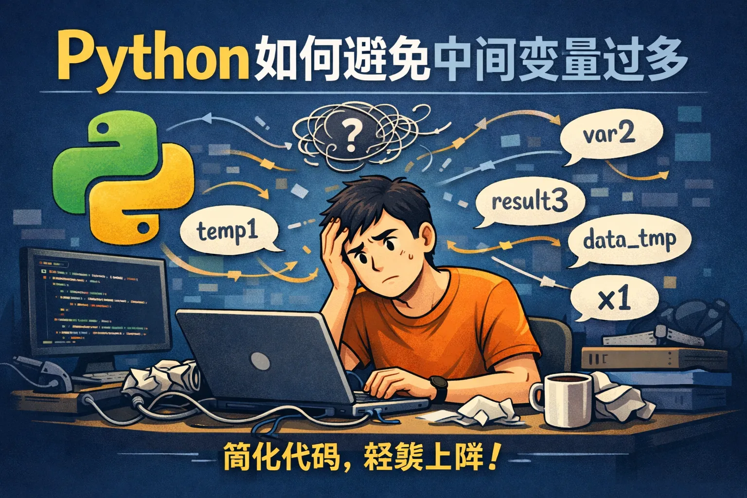 我经常发现自己的Python代码里有很多中间变量,导致代码显得杂乱无章。有什么方法可以减少这些中间变量的使用?