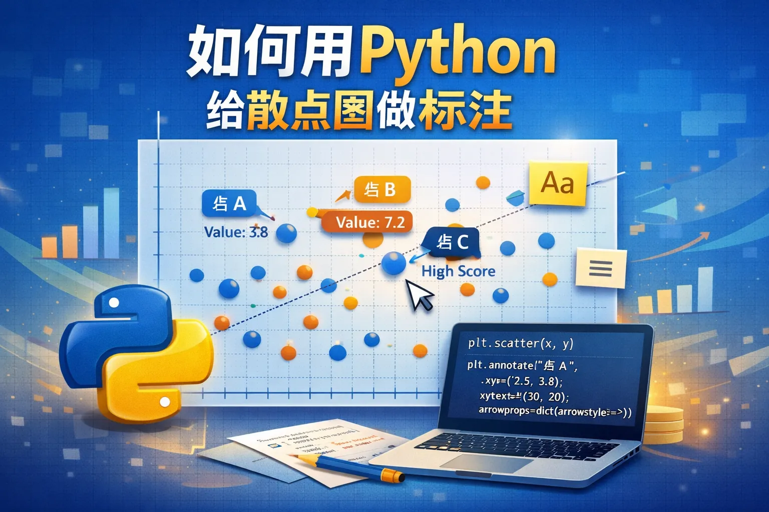 在Python中,matplotlib库是绘制散点图的常用工具。使用plt.scatter绘制散点图后,可以通过plt.text(x, y, label)在每个点的位置添加对应的标签文本。此外,使用annotate方法可以实现更灵活的标注,比如带箭头指示的标签。