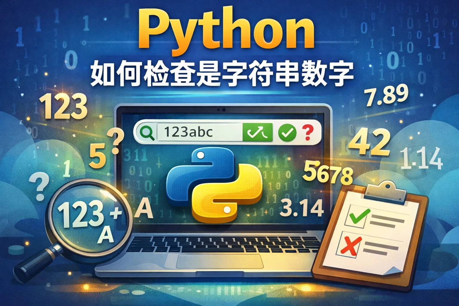可以使用 try-except 语句尝试将字符串转换为 int 或 float 类型。如果转换成功,说明字符串是数字;若抛出 ValueError 异常,则字符串不代表数字。例如: