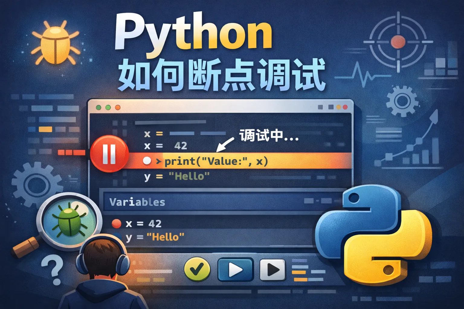 在Python中,你可以使用内置的调试器模块pdb进行断点调试。只需要在想要暂停执行的位置插入代码行import pdb; pdb.set_trace(),程序运行到这里时就会进入调试模式。此外,现代的IDE如PyCharm和VS Code也支持可视化断点设置,只要点击代码行左侧的空白区域就能设置断点,之后运行调试模式来逐步查看程序运行情况。