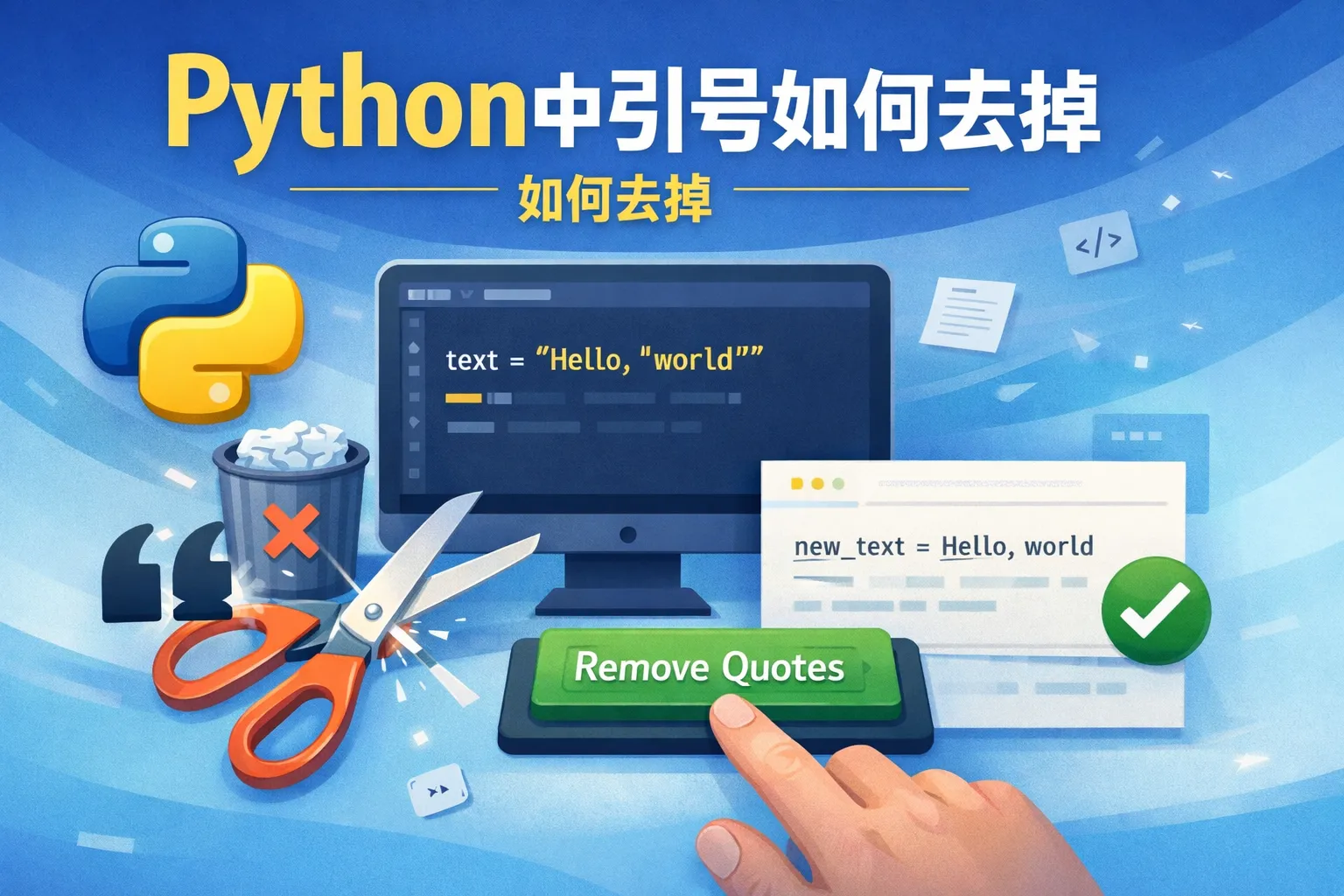 可使用字符串的replace方法,将所有的单引号或双引号替换为空字符串。例如:s = 'He said "Hello"',执行s.replace('"', '')会去掉所有双引号,得到字符串'He said Hello'。可以连续使用replace去除单引号。