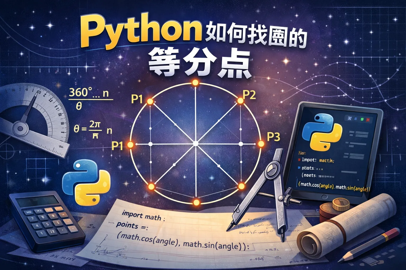 在Python中,怎样计算圆上等分点的具体坐标?需要哪些数学公式和函数?
