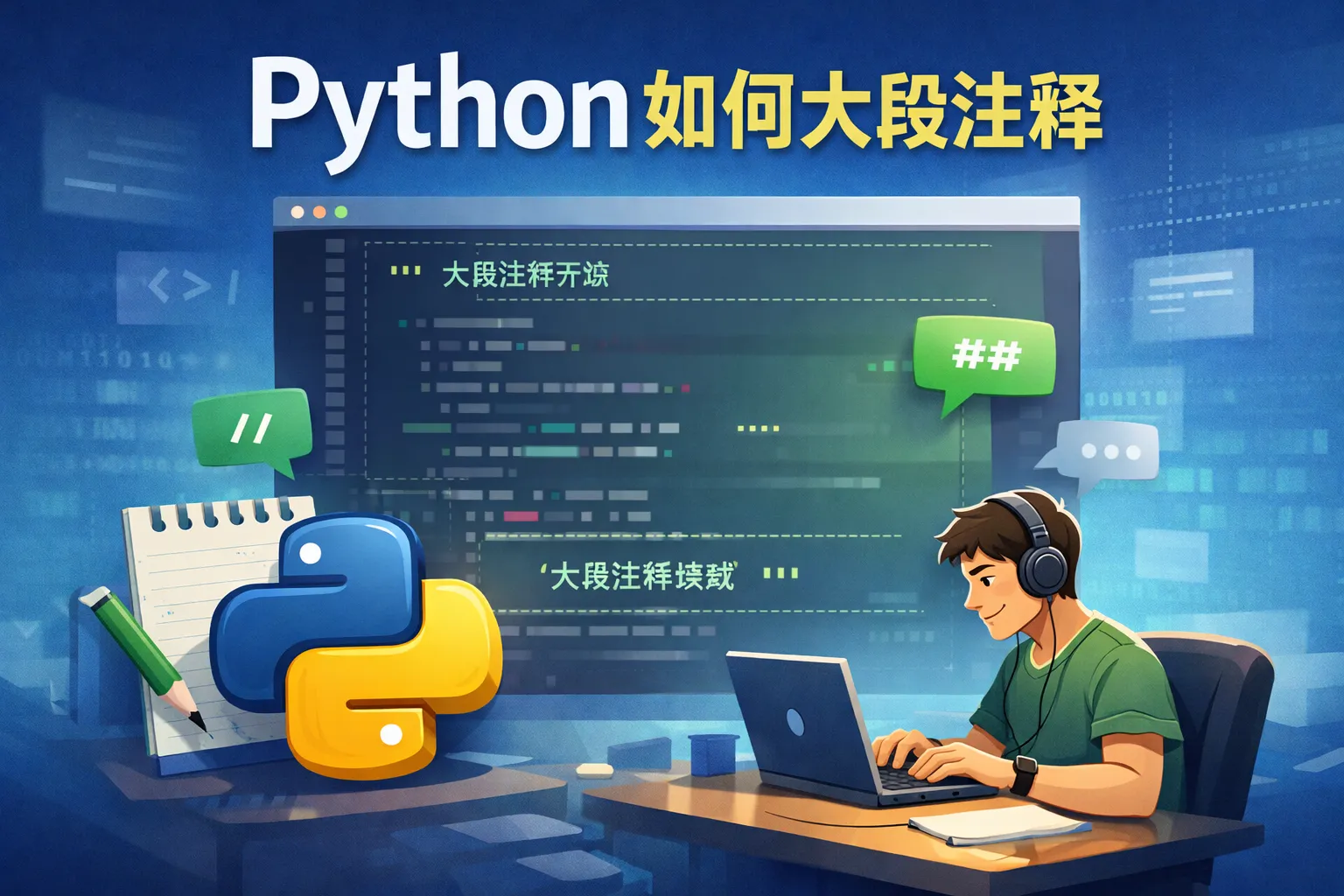 Python 可以利用三引号('''...''' 或 """...""")将多行代码或文本注释起来。不过这种方式实际上是创建了多行字符串,且在某些情况下会被保留。更推荐使用现代代码编辑器自带的多行注释快捷键,例如 VSCode、PyCharm 等,都支持选中多行代码后按快捷键一次性注释或取消注释。