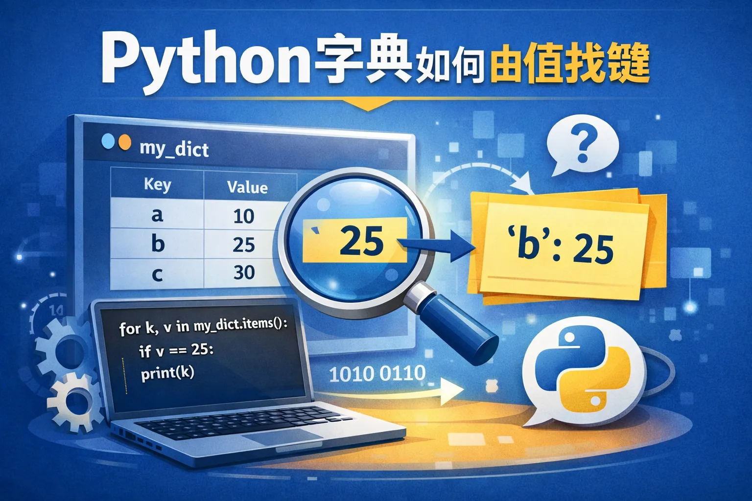 Python字典是键到值的映射,不能直接通过值查找键。可以遍历字典项(键值对),检查值是否匹配,找到对应的键。例如: