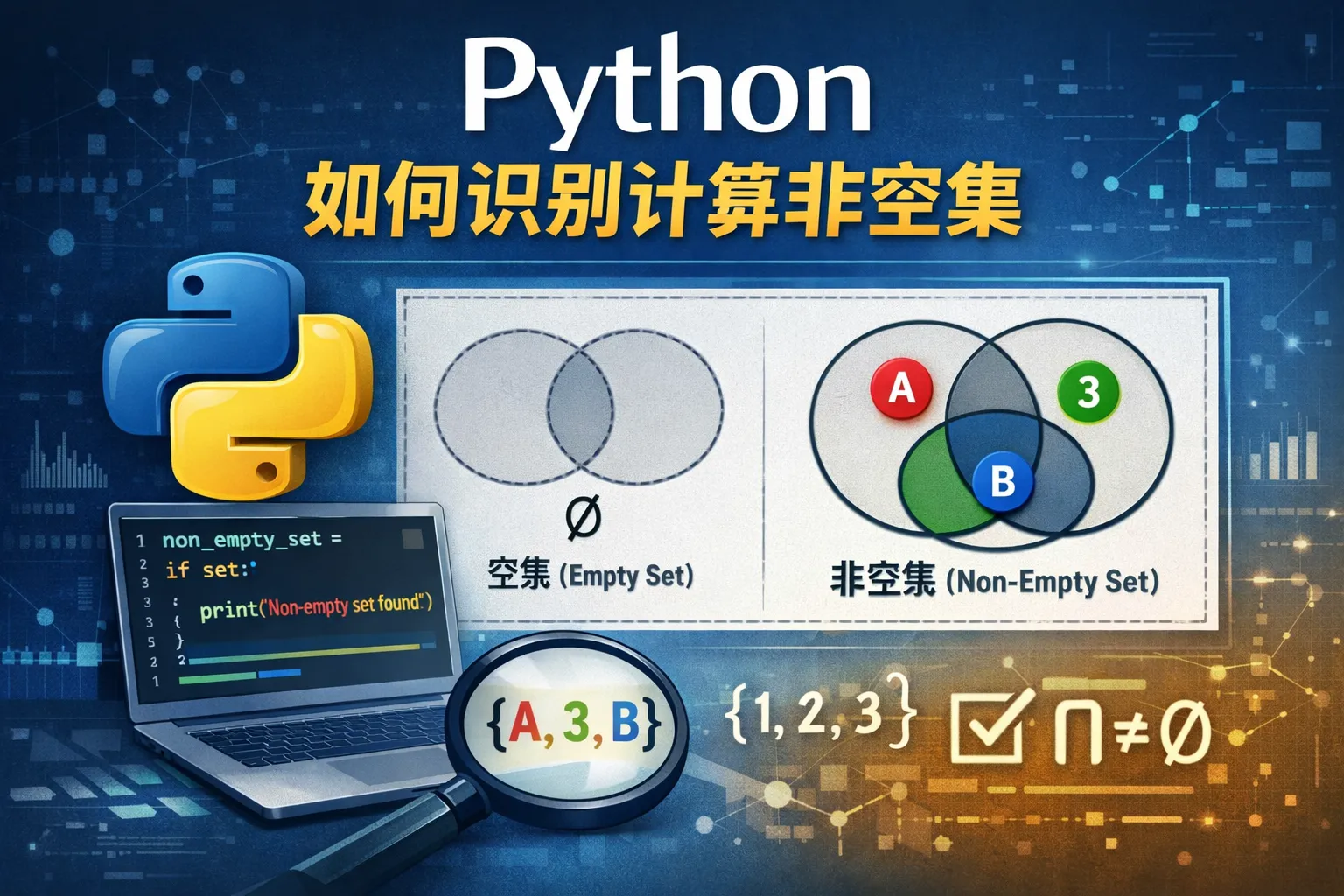 Python中的集合(set)是基于哈希的无序不重复元素集合。正确识别非空集合时,要确认数据类型确实是集合,而不是列表、字典或其他类型。使用if集合语句时,只有当集合完全为空时才返回False。且集合中即便含有值为0或False的元素,集合依旧被认为是非空。此外,空的字符串或0值不是集合,所以要避免类型混淆。可以用 isinstance(obj, set) 来确认数据类型。