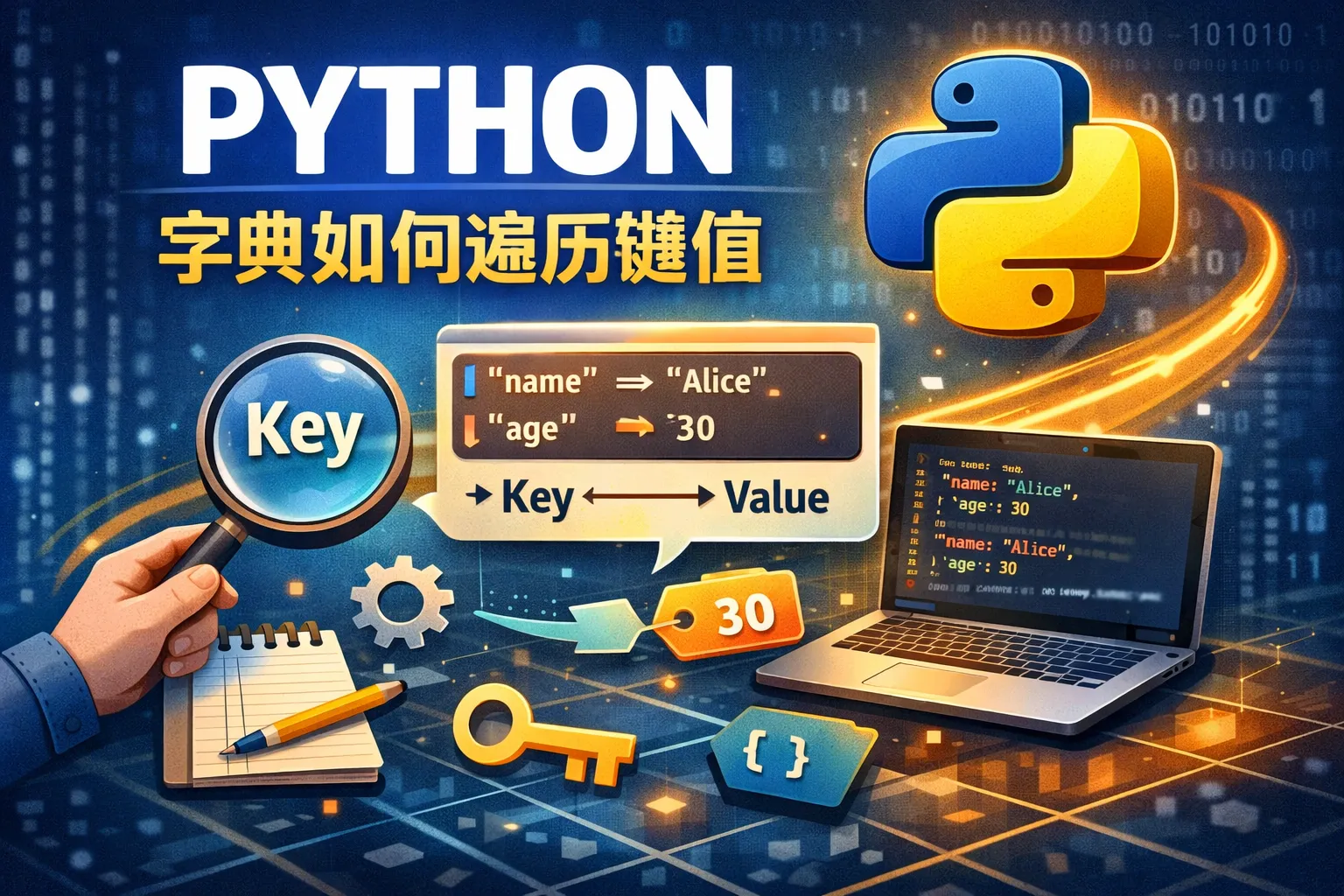 可以使用字典的items()方法,它返回字典中所有键值对的元组组成的视图。通过for循环遍历items(),同时获得键和值,例如:
