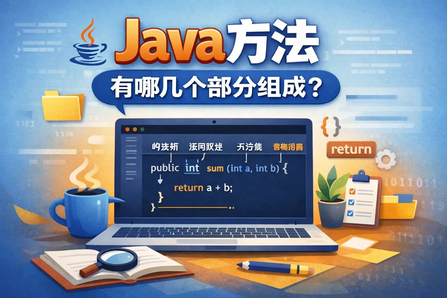 Java 方法由方法修饰符、返回值类型、方法名、参数列表、方法体以及可选的异常声明等核心部分组成,它们共同定义了方法的可见性、输入输出方式和具体行为。方法名与参数列表构成方法签名,决定重载规则;返回值类型和异常声明体现类型与错误契约;方法体承载实际业务逻辑。全面理解这些组成部分,有助于编写结构清晰、职责明确、易维护的 Java 代码,也是提升整体工程质量的重要基础。