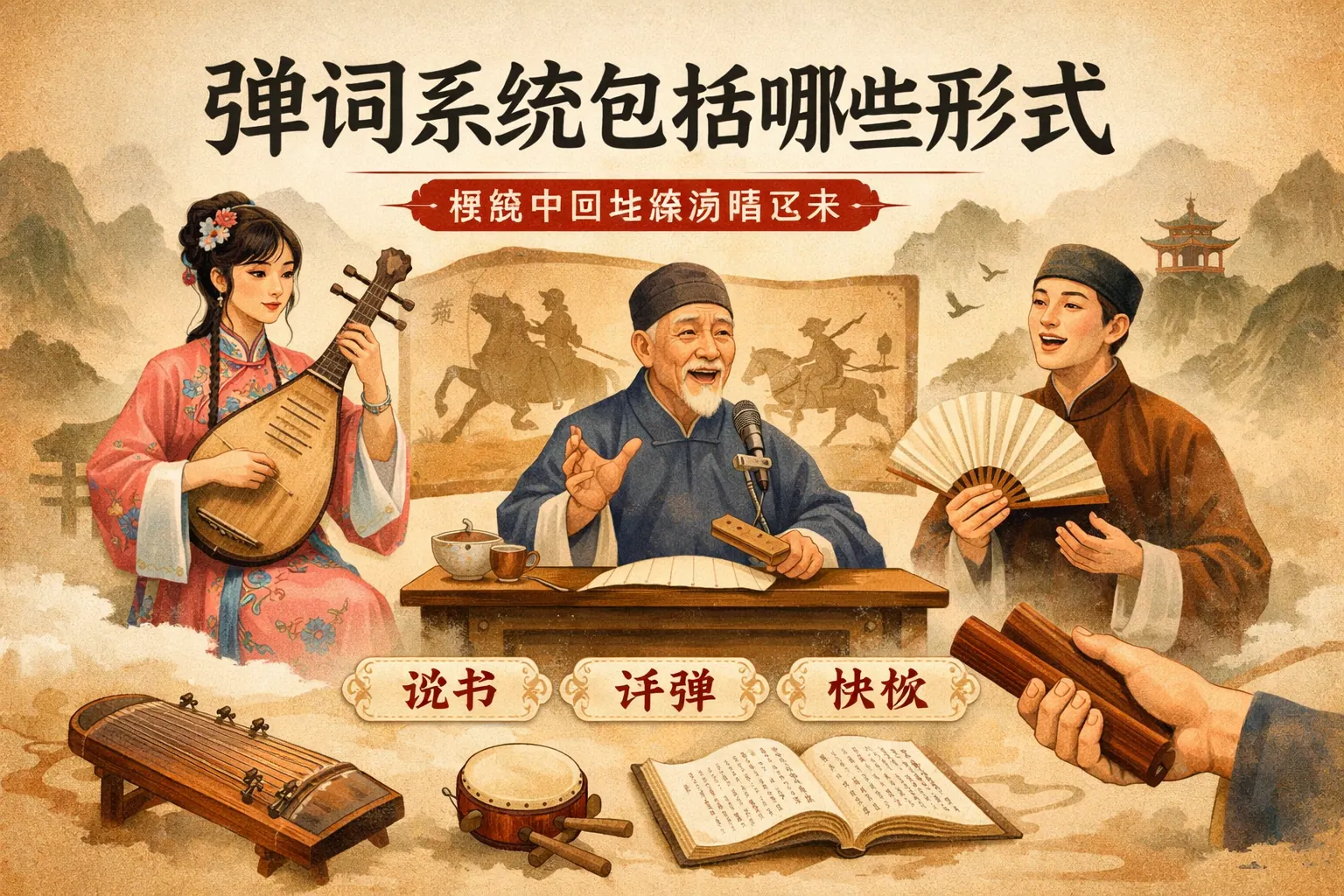 弹词系统包括地域分支、表演档制、音乐曲调、长篇书目与流派传承等多个层面,形成完整的说唱艺术结构。其主要形式包括苏州弹词、扬州弹词和四明南词等地域形态,以及单档、双档和群档等演出组合方式,同时以板腔体曲调体系和长篇叙事书目为核心。弹词不仅是音乐艺术,也具备文学与社会教化功能,在现代发展中正通过舞台化与数字化方式实现传承与创新。