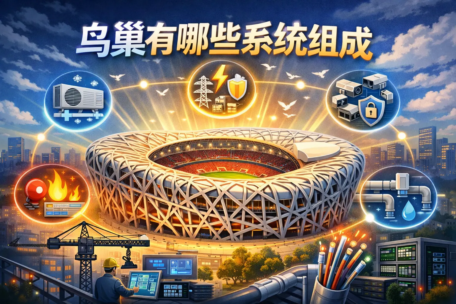 鸟巢由钢结构主体、屋面围护、机电能源、智能化系统、安防应急、观众与交通组织、赛事转播声光以及运营维护管理等多个系统组成,形成高度集成的大型公共建筑体系。各系统在结构安全、能源保障、信息管理和观众体验方面相互协同,使鸟巢既具标志性造型,又具备稳定运营能力。随着低碳与数字化趋势发展,未来大型体育场系统将更加智能化与绿色化。