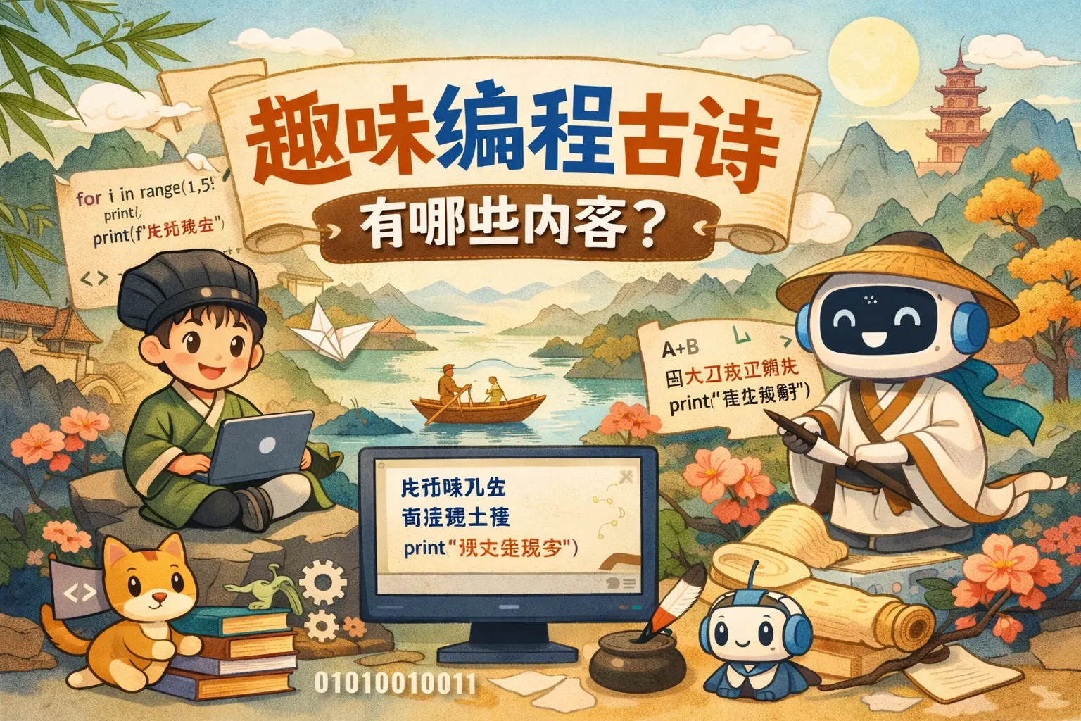 趣味编程古诗是将变量、循环、递归、算法、调试等编程概念融入古诗形式的一种技术文化表达方式,既具文学趣味,也具知识传播价值。其常见内容包括基础语法、控制结构、数据结构、算法思想和开发日常,通过意象化语言帮助理解抽象逻辑,适用于教学启蒙和技术文化传播。在跨学科教育趋势下,这种融合表达方式具有持续发展的潜力。
