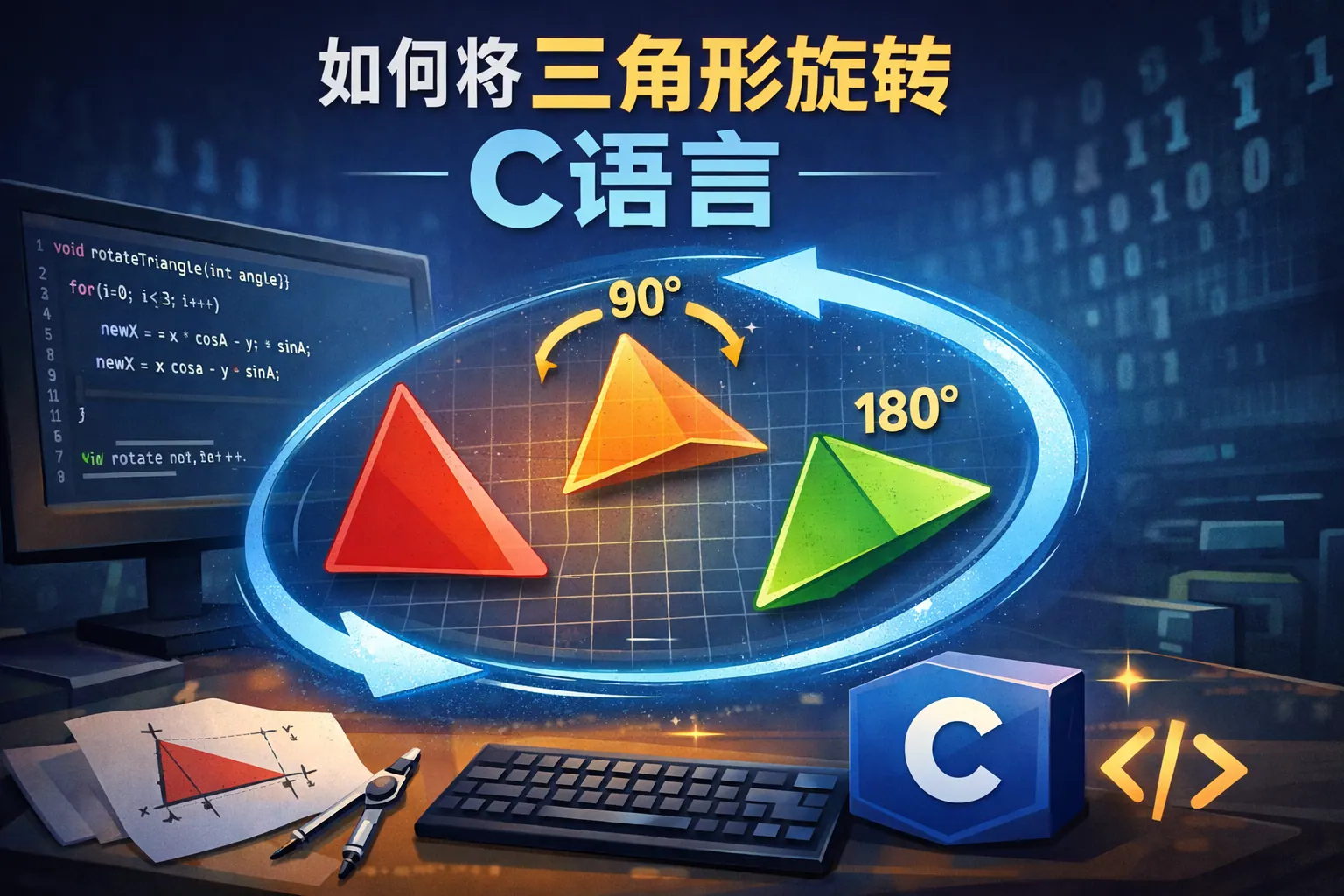 文章系统讲解了如何在 C 语言中实现三角形旋转,从坐标表示、二维旋转矩阵原理入手,详细分析了围绕原点和任意点旋转的通用方法,并结合工程实践讨论了精度误差与常见问题。通过数学与代码逻辑的结合,说明三角形旋转本质是对顶点坐标的统一变换。最后指出该方法在图形学、嵌入式和仿真领域的长期价值与发展趋势。