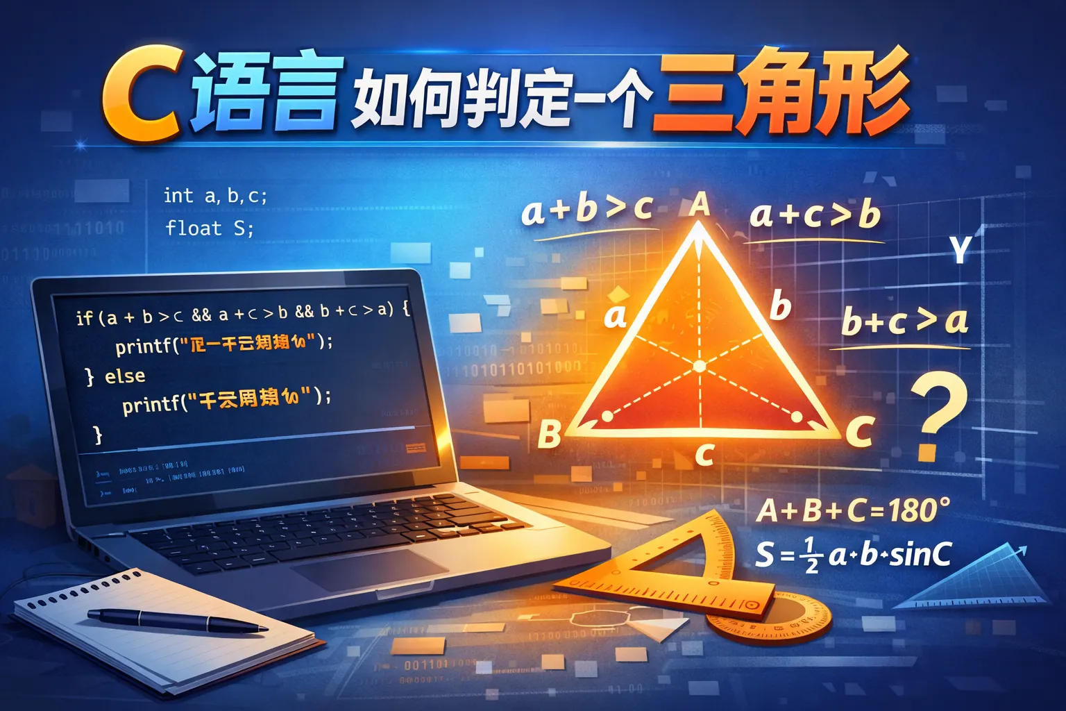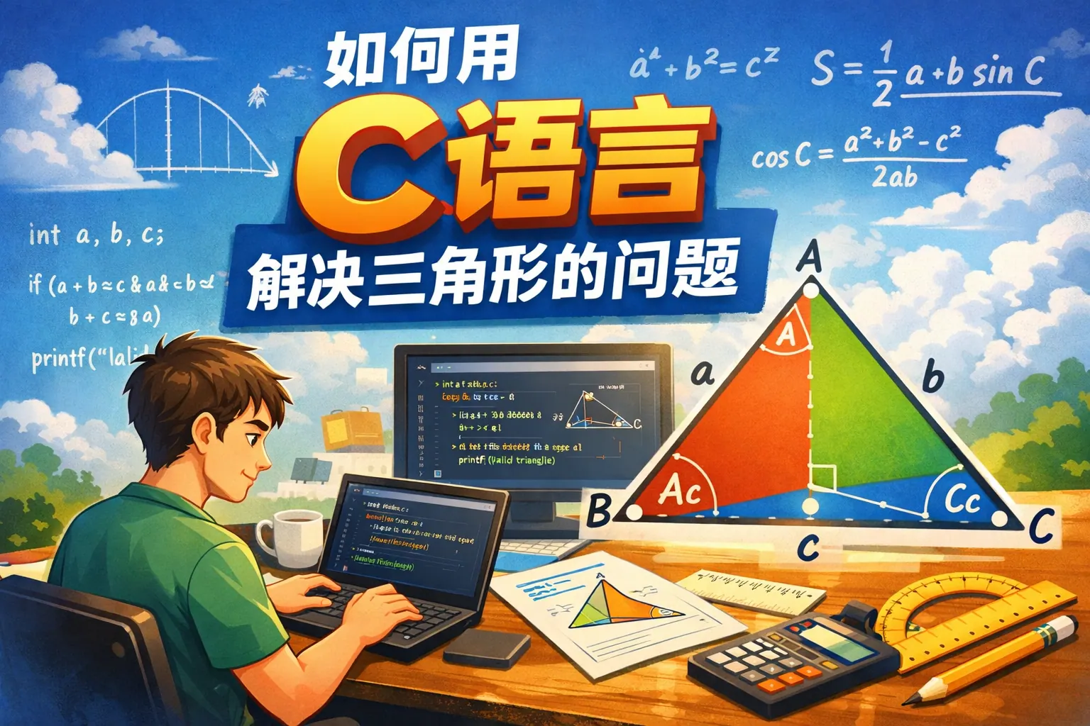 本文系统讲解了如何用C语言解决三角形问题,包括三边合法性判断、三角形类型识别、海伦公式面积计算以及结构体封装方法。通过数学原理与代码示例结合,展示了完整的实现流程,并分析了常见错误与优化技巧。文章还扩展介绍了三角形在工程与算法训练中的应用价值,强调将几何定理转化为条件判断和函数封装是解决此类问题的关键。掌握这些方法可以为后续几何算法与程序设计学习打下坚实基础。