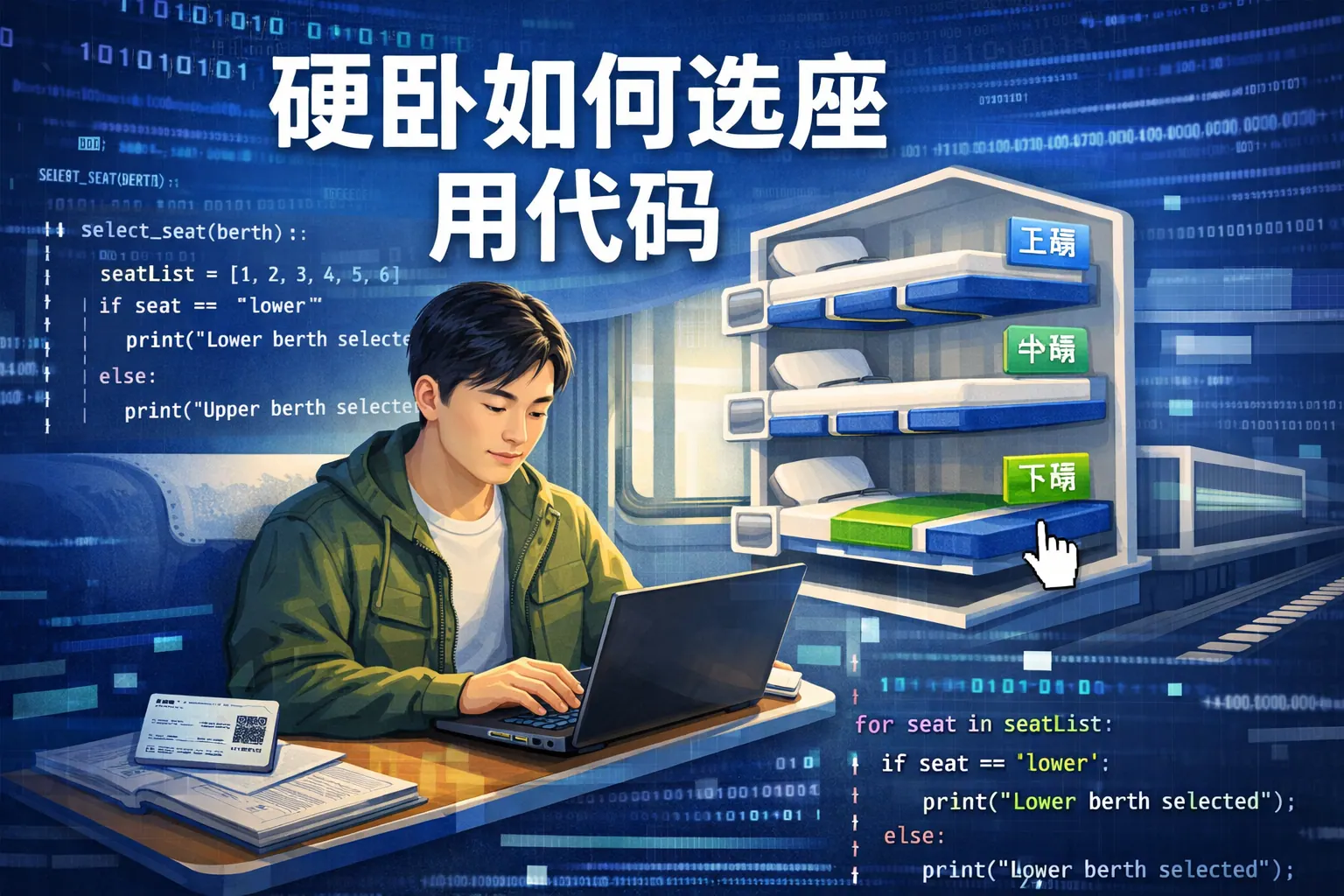 通过代码选择硬卧铺位,关键在于理解铁路席位编号规律和售票系统逻辑,并利用取模算法判断铺位类型,再结合优先级评分模型和时间控制策略提高选到理想铺位的概率。程序无法保证指定铺位,但可通过规则匹配、车厢结构优化和容错排序机制显著提升成功率。未来硬卧选座将趋向数据驱动和智能推荐化发展。