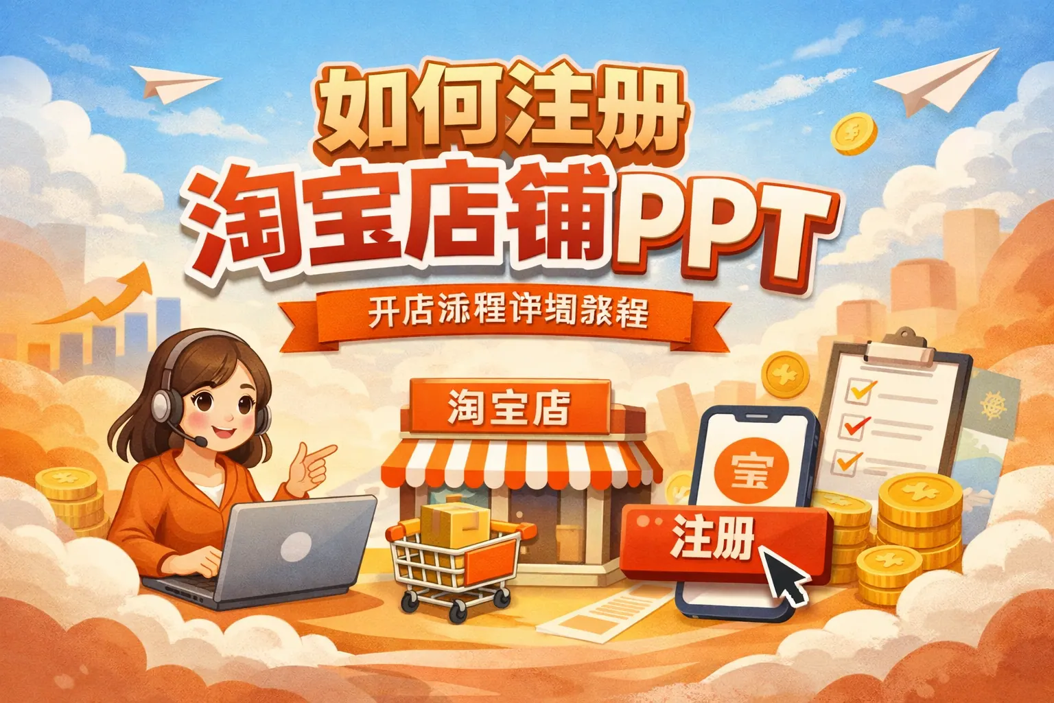 制作“如何注册淘宝店铺”PPT应系统涵盖注册准备、实名认证流程、店铺类型选择、保证金与费用结构、详细操作步骤、开店后基础设置以及常见风险提示。个人卖家通常准备身份证、支付宝实名认证账户即可完成开店,审核时间一般为1-3个工作日。除了注册流程,还应重点说明费用构成和合规要求,避免新手误区。完整结构清晰、逻辑全面的开店PPT,不仅讲步骤,更要讲规划与风险控制。