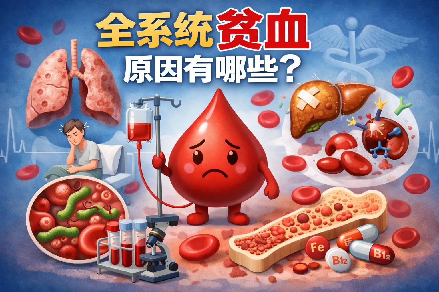 全系统贫血通常由造血原料缺乏、骨髓造血功能障碍、红细胞破坏增加以及慢性疾病影响等多种因素共同导致,并非单一问题。常见原因包括缺铁、维生素B12或叶酸缺乏、慢性肾病、炎症性疾病、遗传性血液病以及消化道慢性失血等。准确诊断需要结合血常规、铁代谢、骨髓检查及相关功能检测,关键在于明确病因后针对性治疗,而不是单纯补血。随着精准医学发展,系统性贫血的筛查和管理将更加科学化与个体化。
