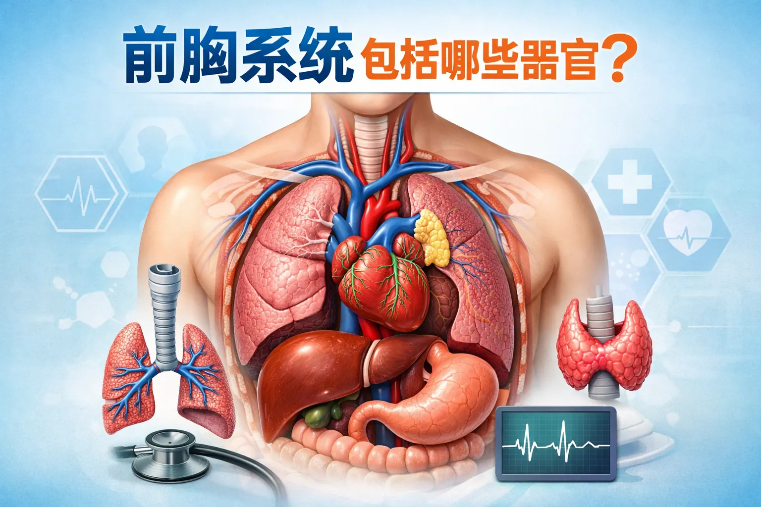 前胸系统主要包括心脏、肺脏、气管与支气管、大血管、胸腺、食管胸段以及胸壁结构等器官与组织,涵盖循环、呼吸、免疫和部分消化功能。这些器官在胸腔内高度协同,承担气体交换、血液循环和生命维持等关键作用。理解前胸系统的组成与功能,有助于科学判断胸痛、胸闷、呼吸困难等常见症状来源,并提升日常健康管理意识。
