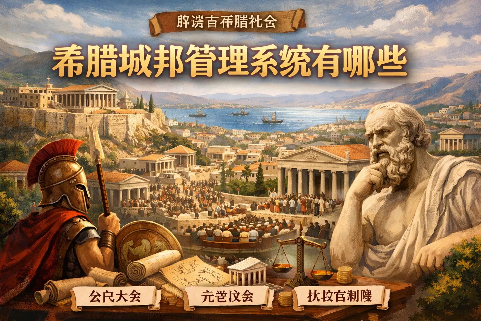 希腊城邦管理系统包括公民大会、议事会、执政官体系、军事统帅机制、司法陪审制度、财政管理及宗教协同结构等模块,形成了以公民参与和权力分散为核心的治理体系。雅典强调直接民主与抽签轮值,斯巴达则采用双王制与长老会议结合的混合政体。整体制度体现出分权制衡、公开监督与公共责任理念,对现代公共治理和组织管理具有持续启示意义。