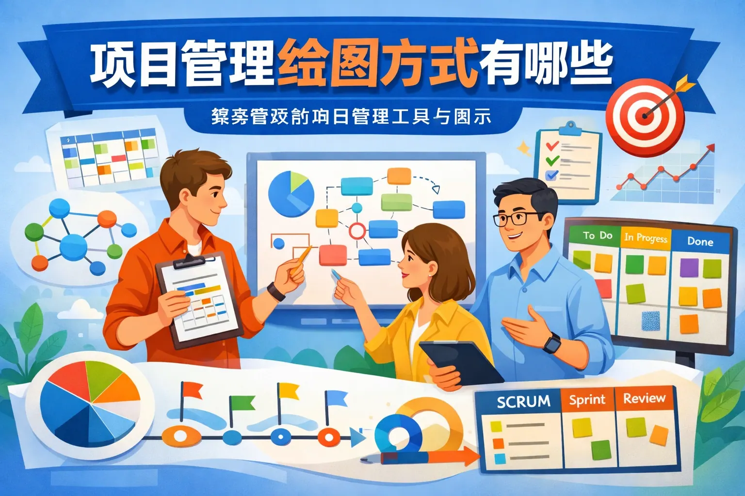 项目管理图表包括甘特图、网络图、燃尽图、看板图、RACI矩阵、资源负载图和风险矩阵等,分别用于进度控制、任务逻辑分析、资源分配、责任划分与风险评估。不同图表适用于不同阶段与管理模式,应根据项目类型组合使用。随着数字化发展,项目管理图表正从静态展示走向智能化与数据驱动分析,成为提升透明度与决策效率的重要工具。