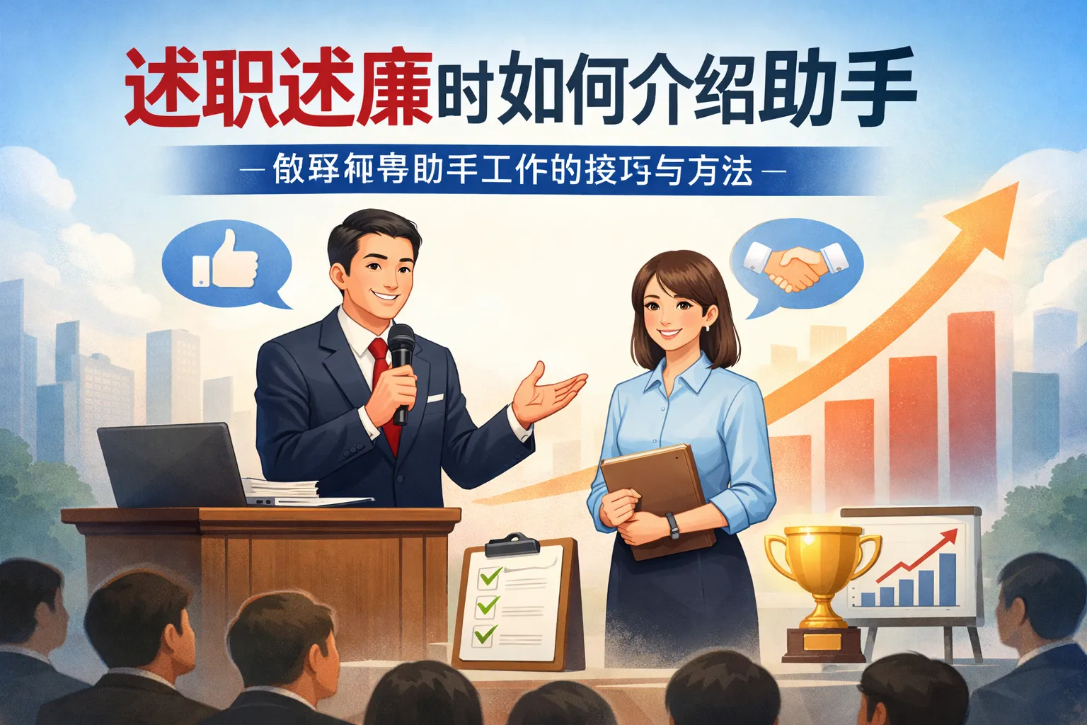 本文围绕述职述廉中介绍助手的核心要点展开,提出需兼顾合规性与团队价值传递,按照岗位贡献分层展示而非笼统表述的核心原则,结合分场景话术框架、合规避坑技巧与实战案例,说明合理介绍助手既能体现管理者的团队管理与廉政履职能力,又能通过量化数据强化述职说服力,帮助述职者规避廉政风险,提升整体述职表现。