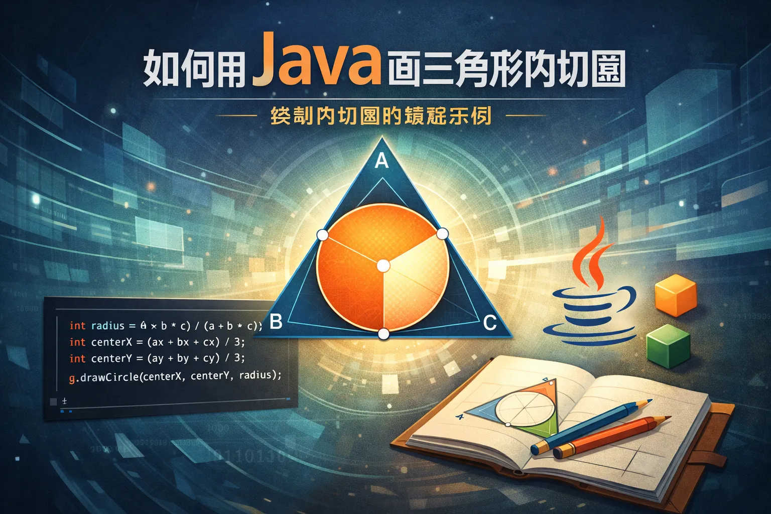 本文详细讲解了Java绘制三角形内切圆的全流程,涵盖几何逻辑推导、坐标转换、开发环境搭建、代码实现、可视化渲染、交互优化和跨平台适配等内容,帮助开发者完成从基础几何计算到实际项目落地的全环节搭建。