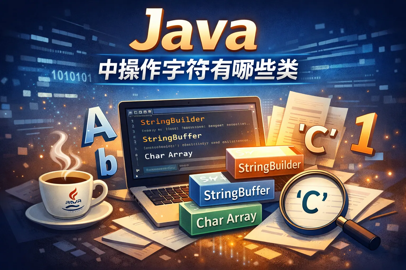 Java中操作字符的核心类包括Character、String、StringBuilder、StringBuffer、Reader/Writer、Charset以及Pattern和Matcher等,它们分别承担单字符判断、字符串处理、可变拼接、字符流读写、编码转换与正则匹配等功能。实际开发中应根据场景选择合适的类,例如频繁拼接使用StringBuilder,文本读取使用字符流,复杂匹配使用正则表达式,从而提升代码性能与可维护性。
