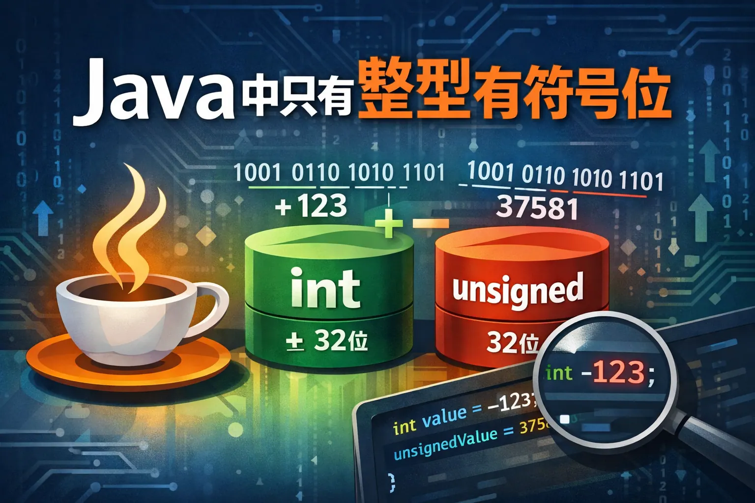 Java 并非只有整型才有符号位。实际上,Java 所有整数类型都采用有符号补码表示,最高位为符号位;浮点数也包含符号位,但遵循 IEEE 754 标准结构;char 是唯一的无符号整数类型。Java 不提供无符号整型关键字,但通过方法支持无符号运算。理解符号位有助于掌握位运算、溢出机制与底层数据表示原理。