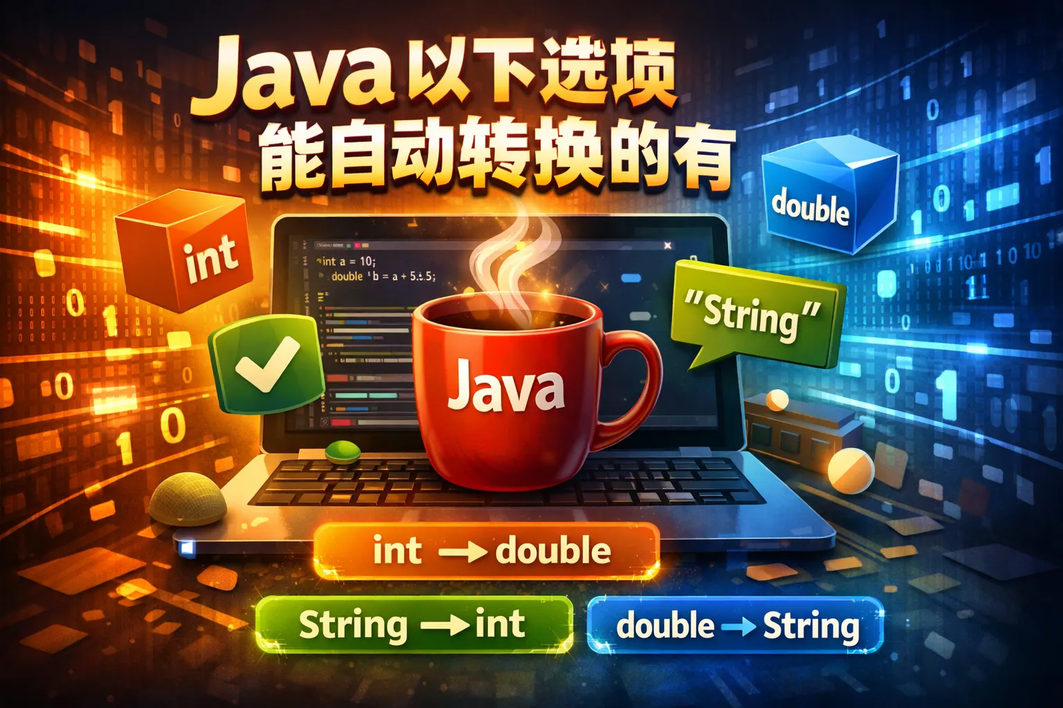 Java 自动类型转换遵循“扩展转换自动、缩窄转换强制”的原则。数值类型只能从表示范围小的类型自动转为更大范围类型,如 byte→int→long→double,char 只能向 int 及以上转换;boolean 不能与任何类型互转;表达式中 byte、short、char 会自动提升为 int;引用类型只允许子类向父类自动转换。掌握范围扩大与继承向上两个核心逻辑,就能准确判断哪些选项可以自动转换。