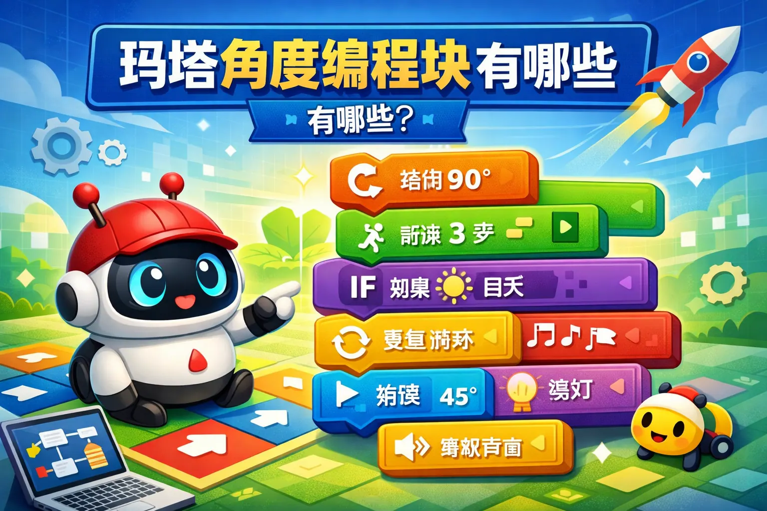 玛塔角度编程块主要包括90°、45°、30°和15°等左右旋转模块,用于控制机器人转向并构建路径与几何图形。基础版本以90°和45°为主,进阶版本增加更小角度模块以支持复杂图形绘制。角度模块结合循环与函数使用,可提升空间认知与算法思维能力,在STEAM教学和几何学习中具有重要价值。未来角度编程块将向更高精度和跨学科融合方向发展。