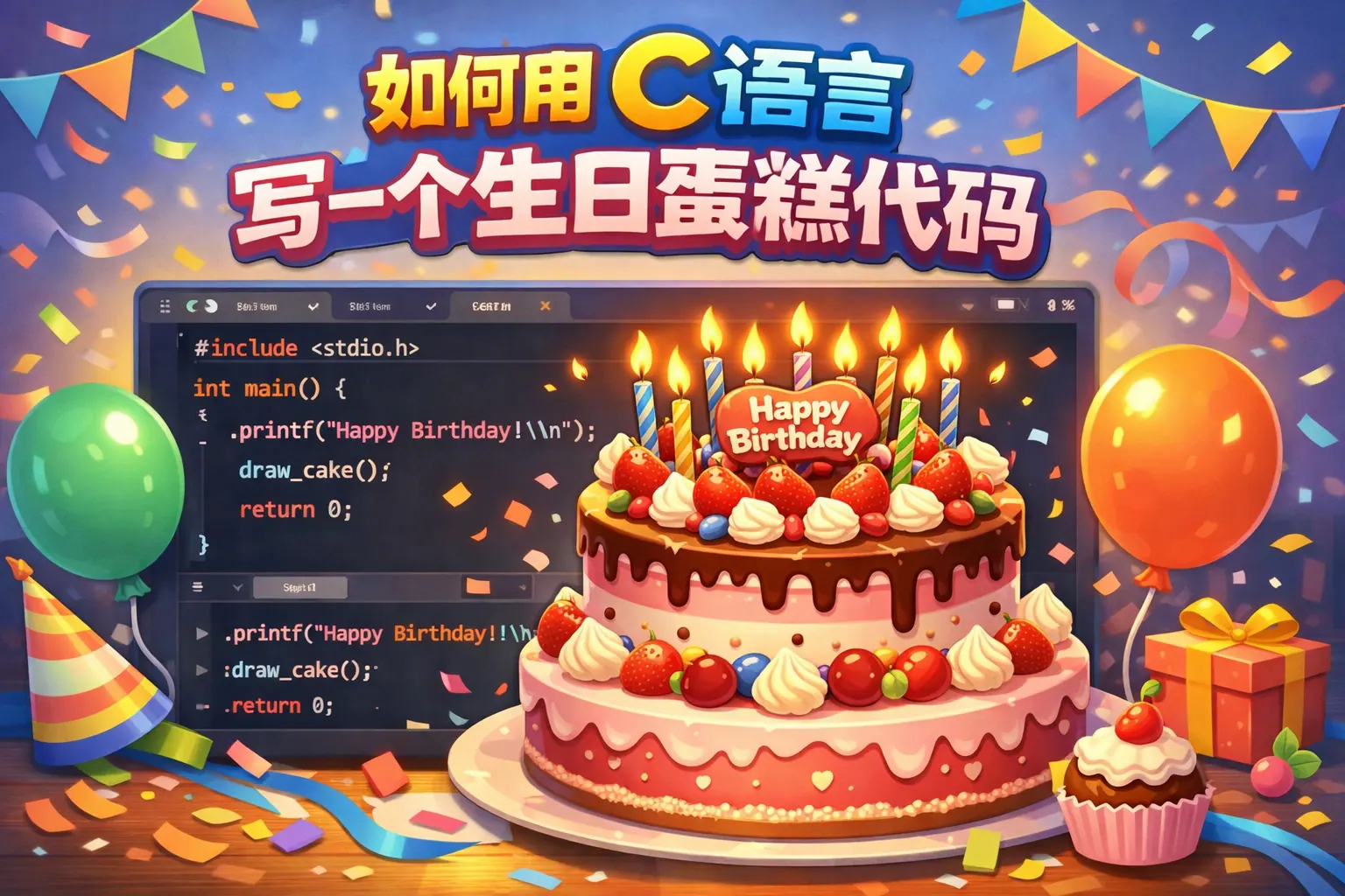 如何用c语言写一个生日蛋糕代码