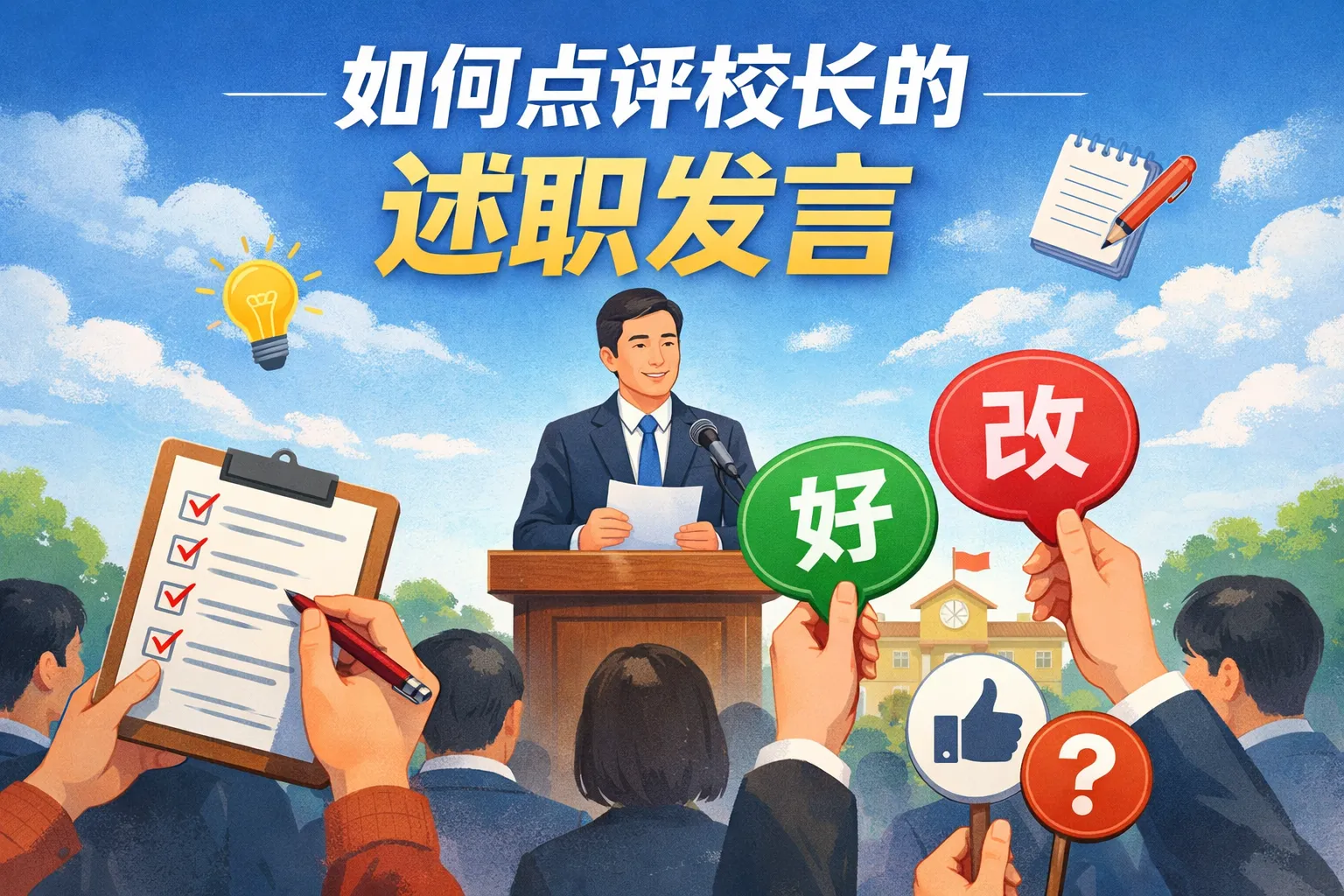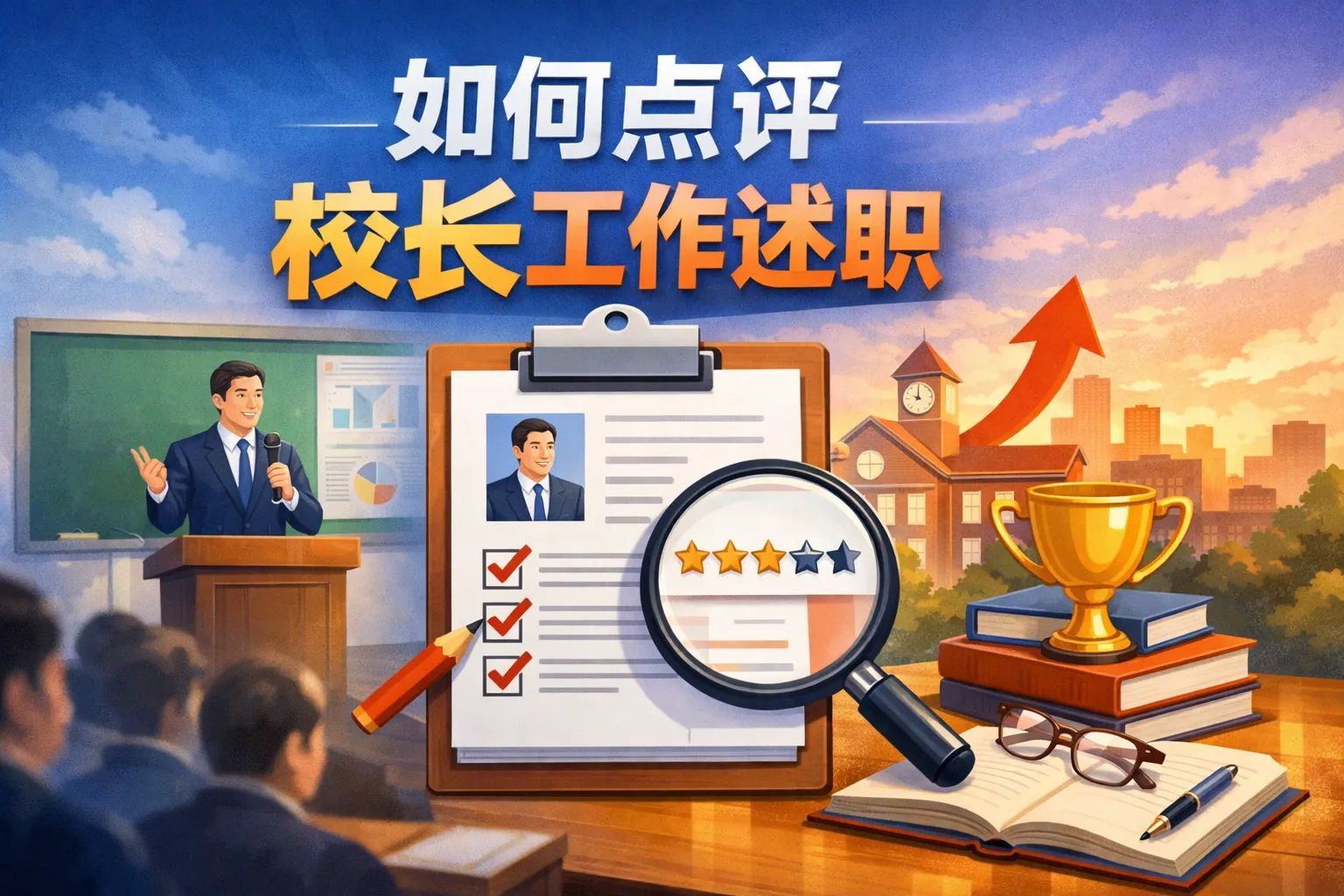 本文围绕校长工作述职点评展开,从明确核心原则、搭建分层点评结构、规避常见点评误区、适配多场景话术模板、运用数据强化说服力以及做好点评落地跟进六个维度,详细讲解了如何输出专业精准的校长述职点评内容,兼顾评价客观性与指导实用性,帮助点评者提升点评价值,推动学校后续发展优化