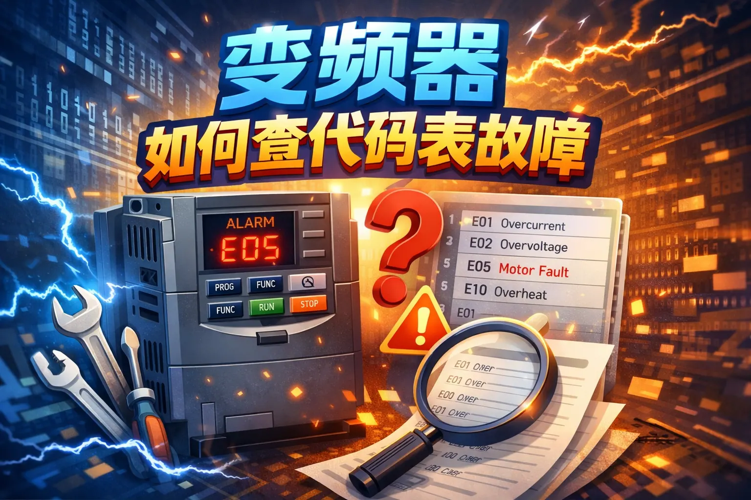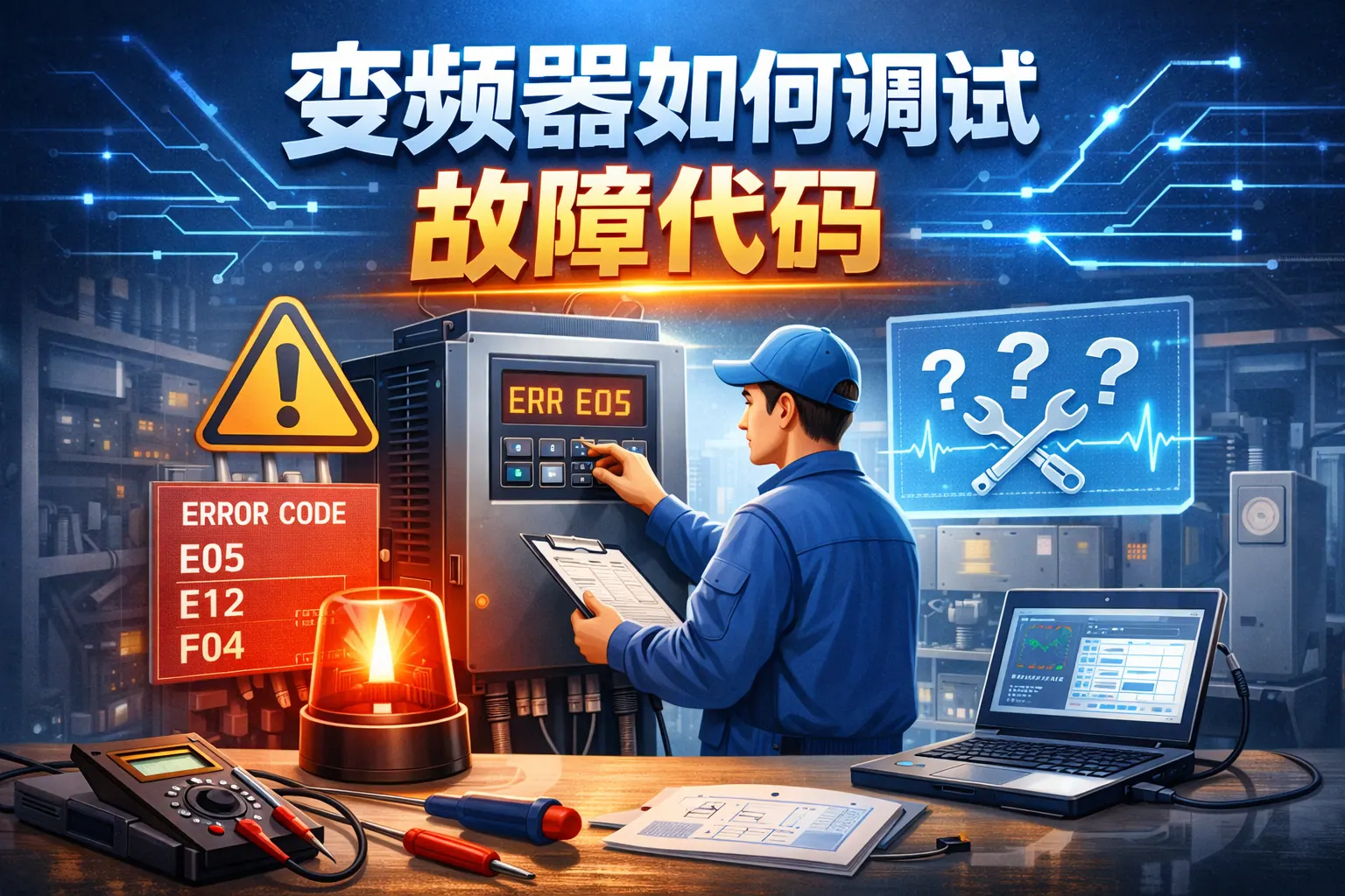 变频器故障代码调试的核心在于准确识别代码含义,并按照电源、负载、参数和环境四步法系统排查。常见故障包括过流、过压、过热和过载等,需结合运行工况与参数设置进行分析。通过规范化流程、合理参数调整及安全操作,可有效缩短停机时间。未来随着智能运维发展,变频器故障处理将逐步向预测性维护升级。
