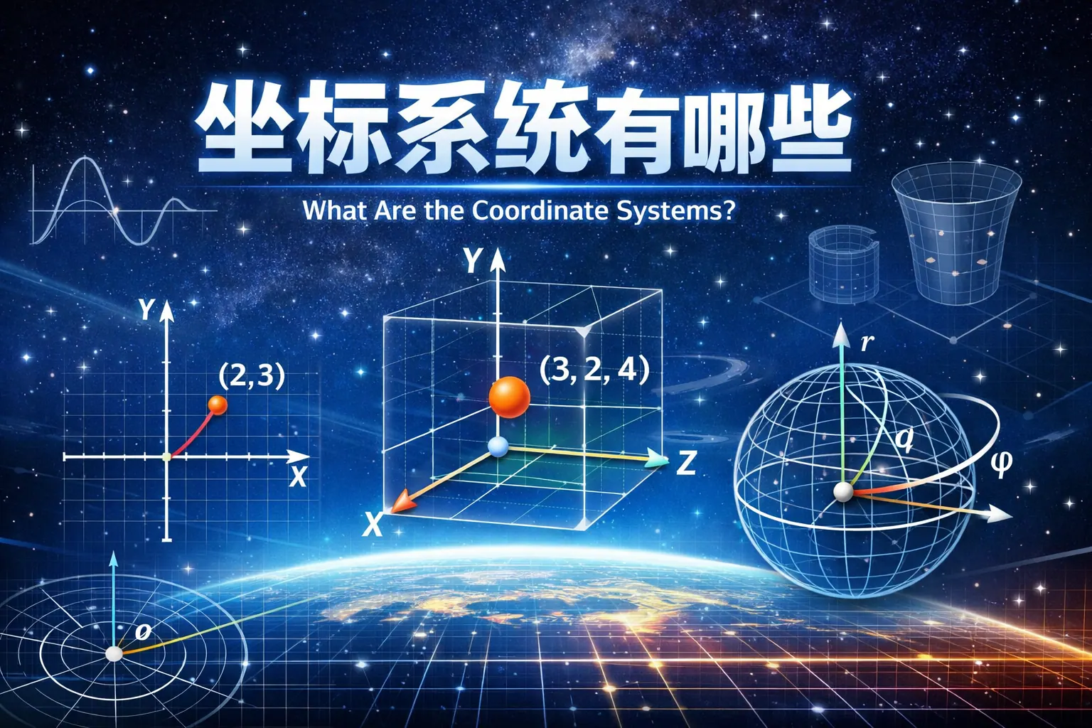 坐标系统是用于描述空间位置和方向的数学工具,常见类型包括直角坐标系、极坐标系、柱坐标系、球坐标系以及地理与工程坐标系统等。不同坐标系统在表达方式、计算复杂度和应用场景上存在差异,例如直角坐标适用于通用工程建模,极坐标适合旋转结构,球坐标常用于天文与物理问题,而地理坐标系统则广泛应用于测绘与导航。随着智能化和高精度定位技术的发展,坐标系统正向标准化与多源融合方向演进。