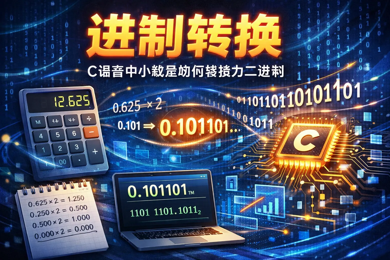 C语言中小数转换为二进制本质分为数学转换与存储编码两部分:数学上通过“乘2取整法”得到二进制展开,而在计算机内部则依据IEEE 754标准编码为符号位、指数位和尾数位。由于多数十进制小数在二进制中为无限循环,因此C语言只能近似存储,产生浮点误差。理解float与double精度差异以及浮点数存储机制,是掌握进制转换与数值计算的关键。