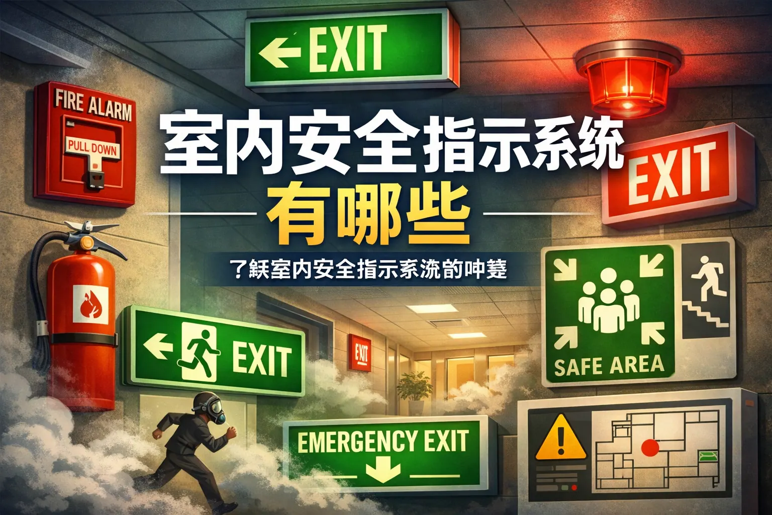 室内安全指示系统包括疏散指示、应急照明、火灾报警、安全标识、应急广播及智能联动系统等多个组成部分,核心作用是引导人员安全疏散、降低事故风险并提升应急处置效率。不同建筑场景对系统配置要求不同,现代趋势正向智能化、数字化与动态联动方向发展,通过系统集成与数据融合提升整体安全管理水平。===