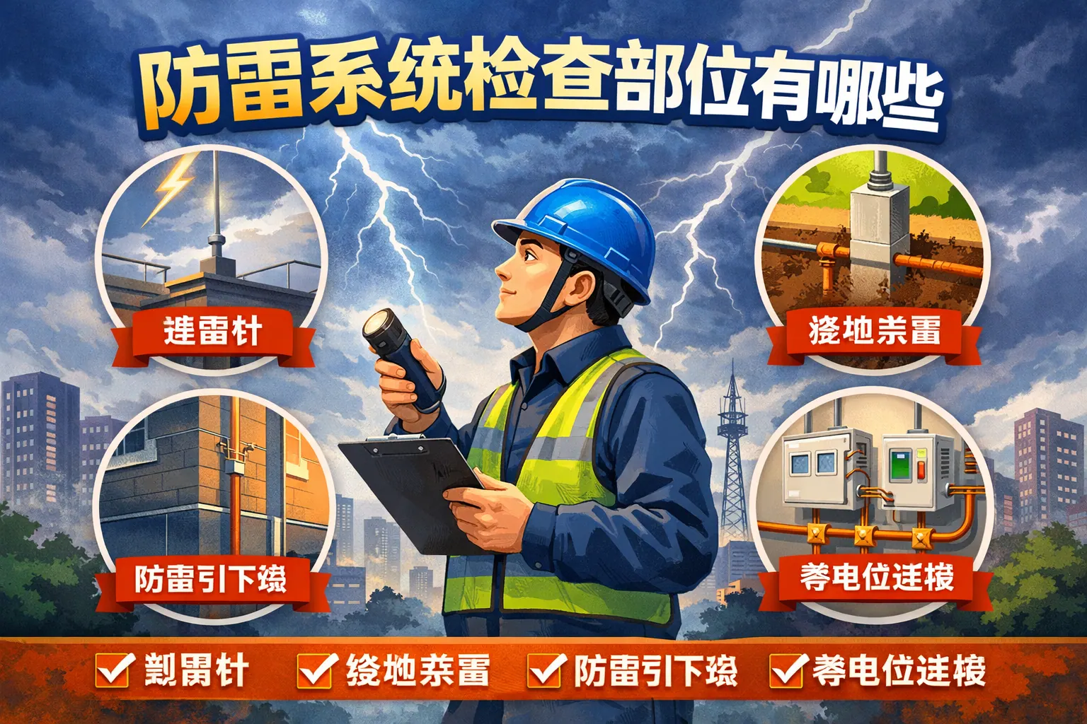 防雷系统检查主要包括接闪器、引下线、接地装置、等电位连接、浪涌保护器、屏蔽布线以及检测记录等关键部位,其中接地电阻和等电位连接是判断系统有效性的核心指标。通过结合国家规范与国际标准,建立系统化检查流程与数字化管理机制,可以确保防雷系统长期稳定运行并降低雷击风险。未来防雷检查将向智能监测与精细化维护方向发展。