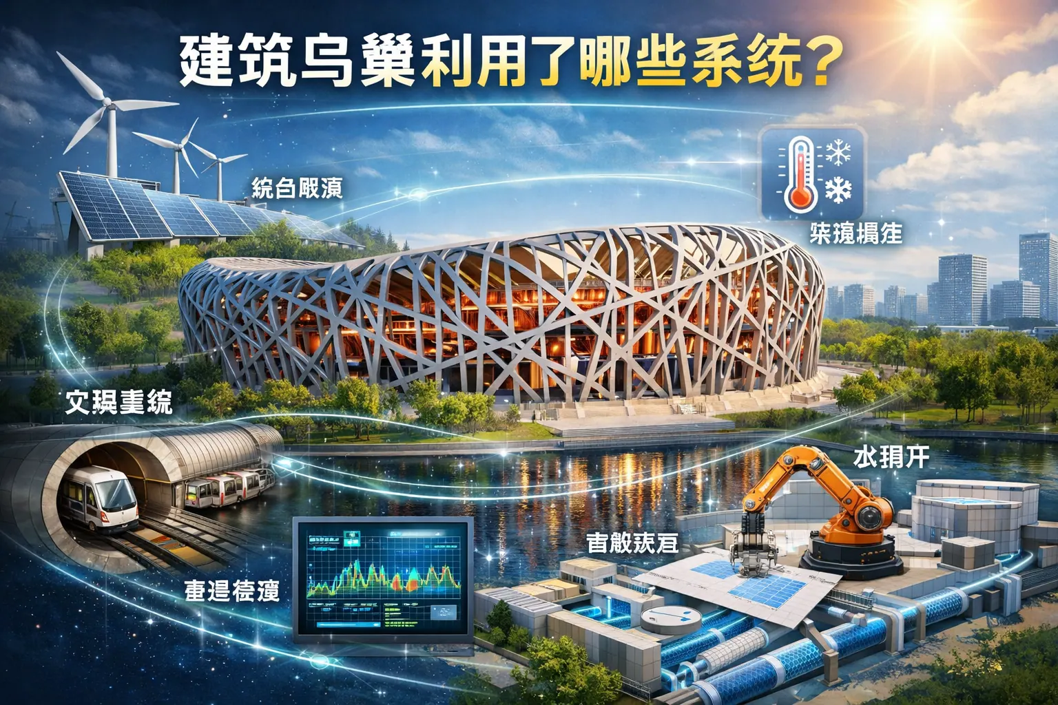 北京鸟巢综合运用了钢结构承重系统、膜结构屋面系统、机电与暖通系统、智能控制系统、消防安全系统以及节能与运营管理系统等多重建筑技术体系,通过高度系统集成实现了大型公共建筑在结构安全、能源效率与智慧运营之间的平衡。其核心在于空间钢结构创新与多系统协同运行,使场馆既满足奥运赛事需求,也具备长期商业运营能力,体现了现代大型体育建筑向数字化与可持续方向发展的趋势。