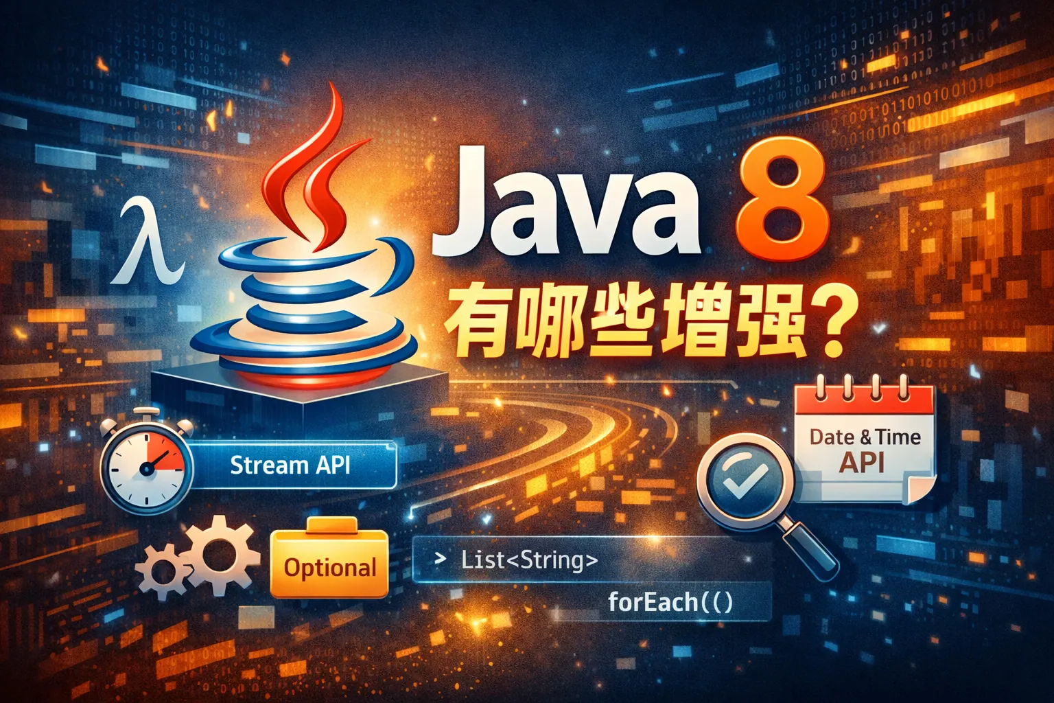 Java8 是 Java 发展史上的关键版本升级,其核心增强包括 Lambda 表达式、函数式接口、Stream API、接口默认方法、Optional 类、全新日期时间 API 以及并发性能优化。这些特性不仅提升了代码简洁性与表达能力,还增强了系统扩展性和并发处理能力,为现代企业级开发奠定了基础,并持续影响后续 Java 版本的发展方向。