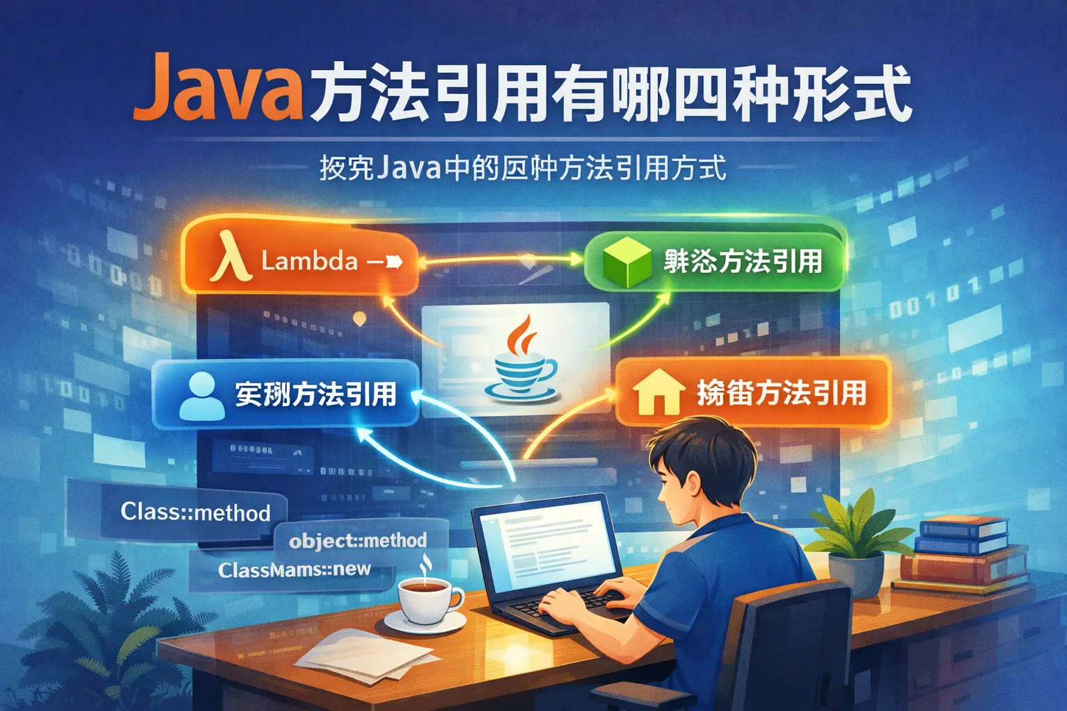 Java 方法引用共有四种形式:静态方法引用、特定对象实例方法引用、任意对象实例方法引用和构造方法引用,均以“::”为核心语法,是 Lambda 表达式的简化写法。静态方法引用用于工具类方法,特定对象方法引用用于已存在实例调用,任意对象实例方法引用常用于排序比较,构造方法引用用于对象创建与工厂场景。方法引用本质是语法糖,可提升代码可读性,是现代 Java 函数式编程的重要组成部分。