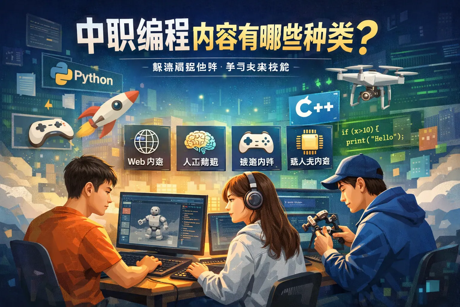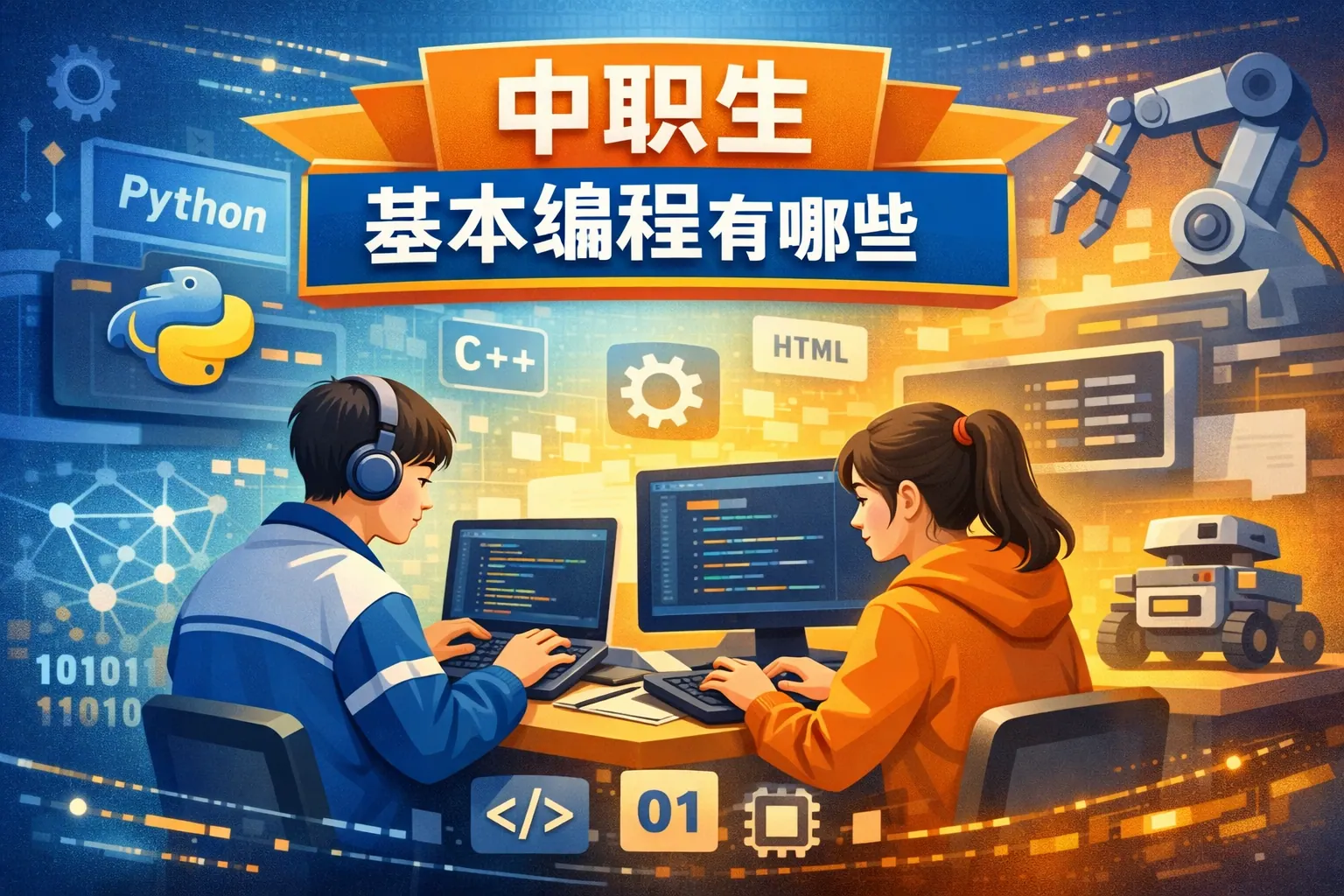 中职编程内容涵盖程序设计基础、Web开发、移动应用开发、数据库技术、网络与系统运维、嵌入式与物联网、软件测试及项目实训等多个方向,强调实践操作与岗位对接,培养具备实际开发与维护能力的技术技能人才。课程结构通常采用基础+专项+项目实训模式,既满足就业需求,也为继续深造打下基础。未来中职编程教育将更加注重复合型能力与项目协作能力的提升。