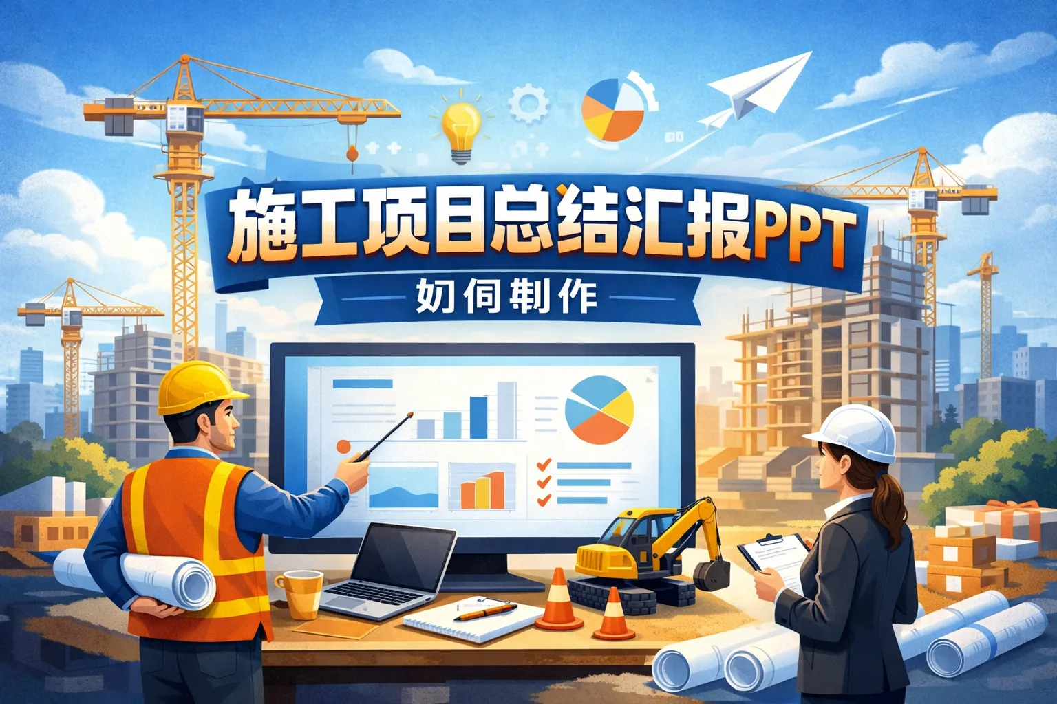 围绕施工项目总结汇报PPT的制作,应先明确受众与决策目标,采用“背景-范围-进度-成本-质量-安全-风险-验收-复盘-计划”的结构,通过甘特图、S曲线、缺陷矩阵等可视化呈现关键指标,并以现场证据与合规证明增强可信度;最终以标准化交付包与版本管理确保复核与审计,同时用复盘驱动持续改进与方法沉淀,结合模板与协作系统提升制作效率与决策效果。