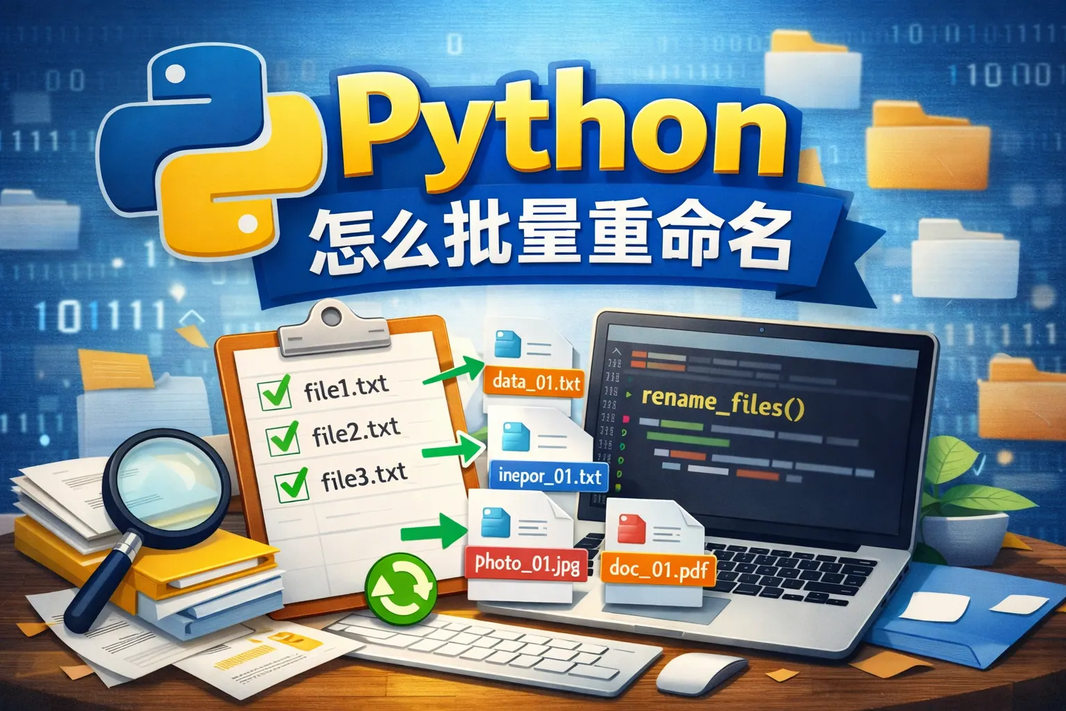 Python 批量重命名文件可以通过 os、pathlib、正则表达式等方式实现添加前缀、自动编号、修改扩展名与规则替换等功能。相比手动修改,批量改名效率更高且可控性强。实践中应注意路径处理、避免覆盖冲突与提前备份。掌握多种方法后,可灵活应对图片整理、日志归档与数据清洗等场景,并为后续自动化处理打下基础。