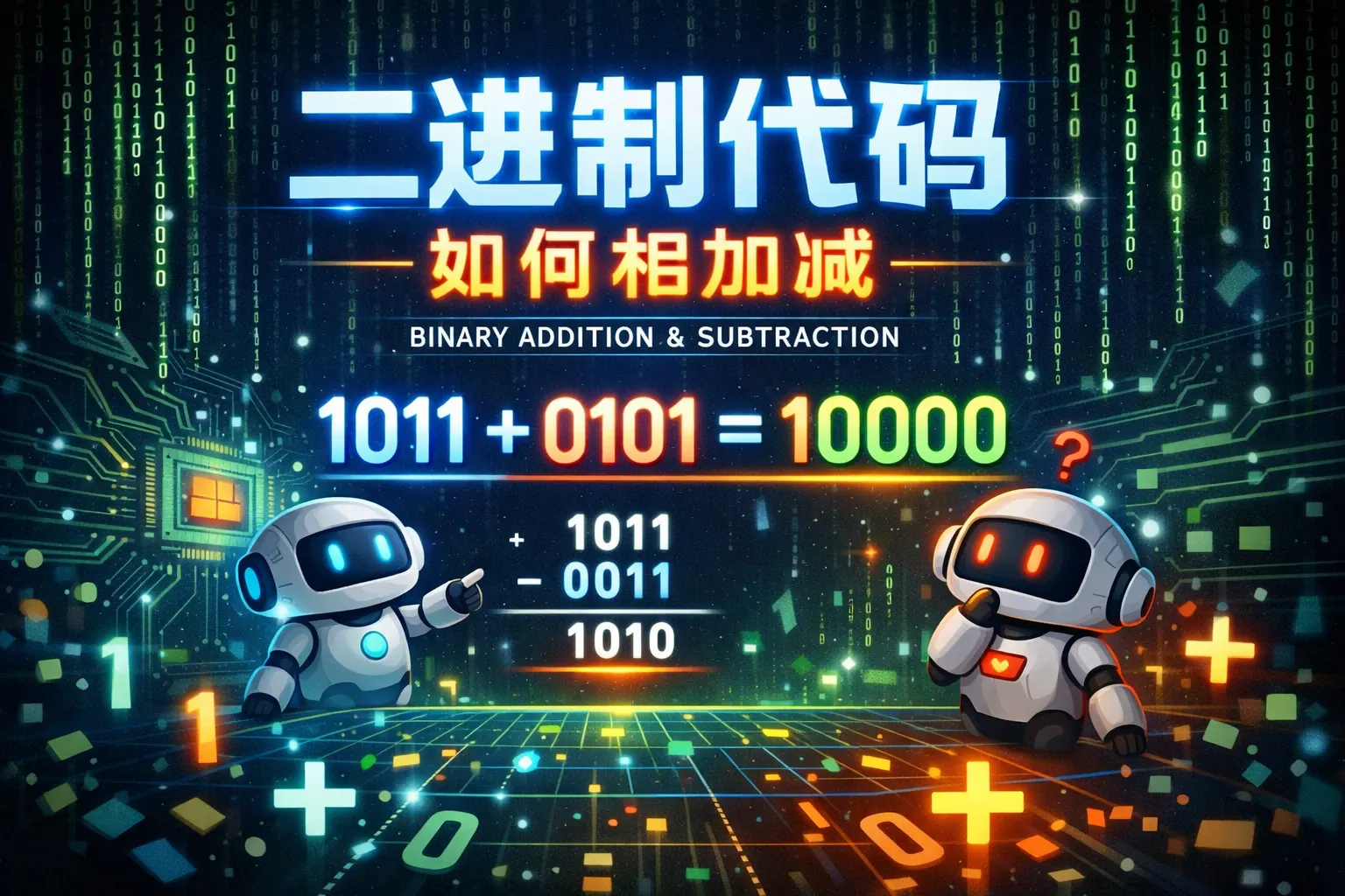 二进制代码相加减的核心在于掌握逢二进一的加法规则、借一当二的减法规则以及补码实现减法的机制。计算机内部通常通过补码将减法转换为加法,从而统一使用加法器完成所有整数运算。理解进位、借位、补码与溢出判断,不仅有助于掌握计算机底层原理,也能提升编程中的位运算能力与系统思维能力。