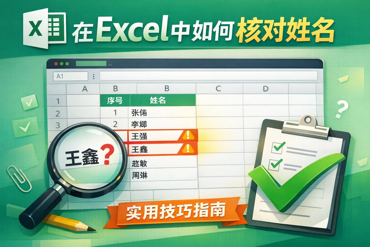 本文详细介绍了Excel中核对姓名的全流程方案,从基础手动核对、COUNTIF单表核对,到VLOOKUP、XLOOKUP跨表匹配,再到Power Query自动化批量核对,结合格式清洗、批量去重实现合规校验,同时涵盖多人协作权限管理、核对结果可视化与存档等企业级落地流程,还针对多音字、无效占位符等常见误区给出避坑指南,帮助办公人员提升姓名核对效率与准确性。
