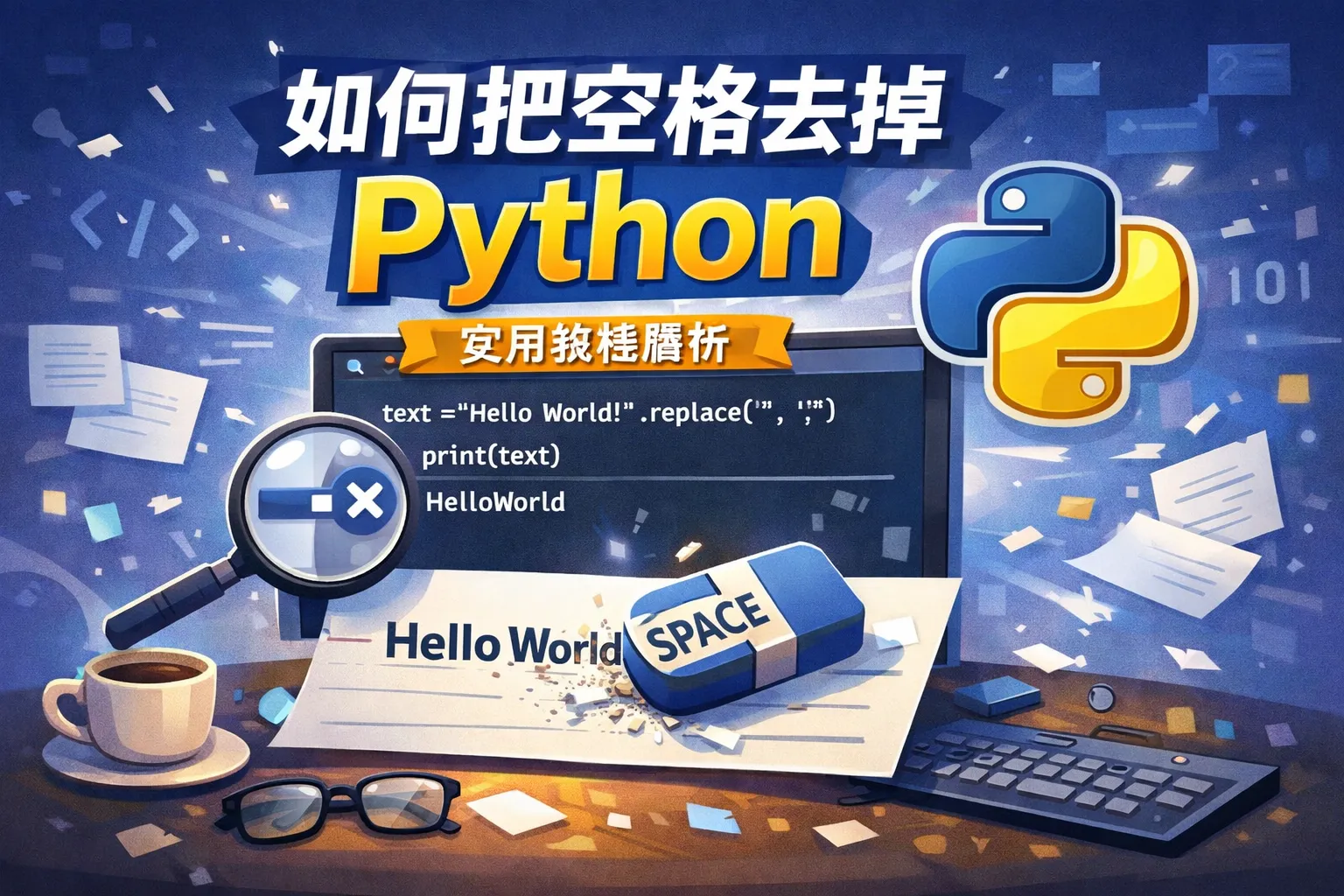 在Python中去空格可按需求选择:删除两端空白用strip(含lstrip/rstrip),删除所有半角空格用replace(' ', ''),压缩或删除任意空白用split/join或正则re.sub(r'\s+', ...)。在含制表符、换行、NBSP、全角与零宽字符的复杂文本中,正则与translate更稳健;大规模处理需流式与预编译优化以控制O(n)时间与空间开销,并以规范与自动化保障质量与一致性。