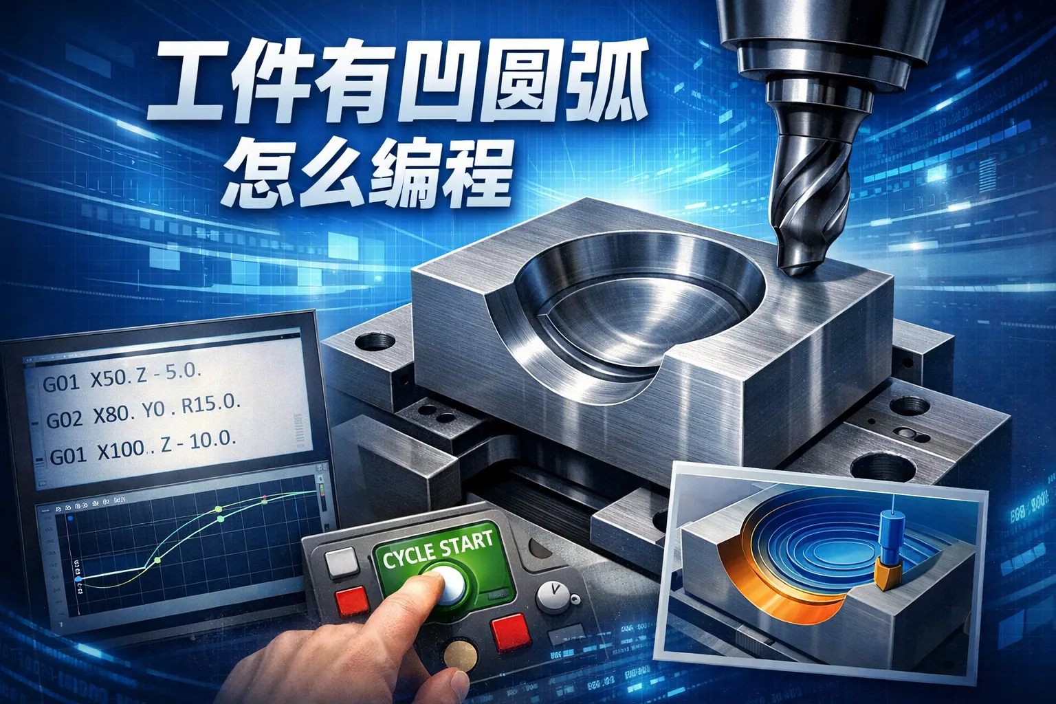 凹圆弧编程的关键在于准确掌握圆弧几何参数、合理选择G02/G03插补方式,并正确使用刀具半径补偿。R值编程适用于简单小角度圆弧,而I、J方式在高精度和大角度加工中更稳定。通过科学计算、方向判断与补偿控制,可有效避免过切与报警问题。未来随着高精度插补与智能优化技术发展,凹圆弧加工将更加高效与稳定。