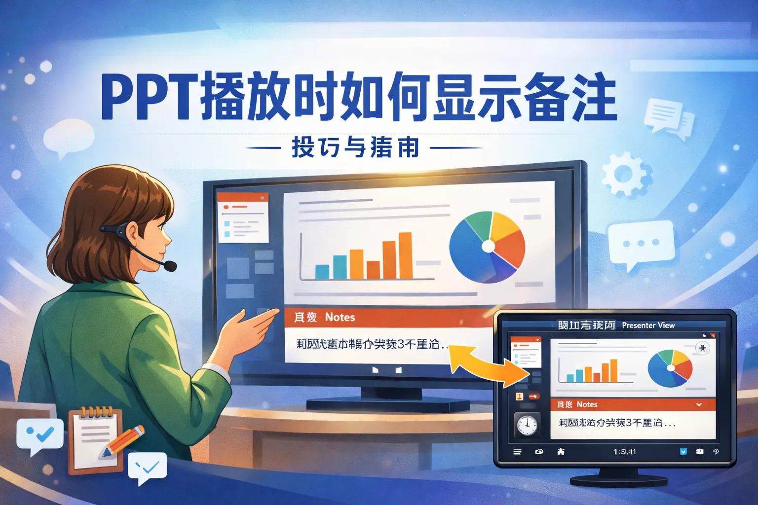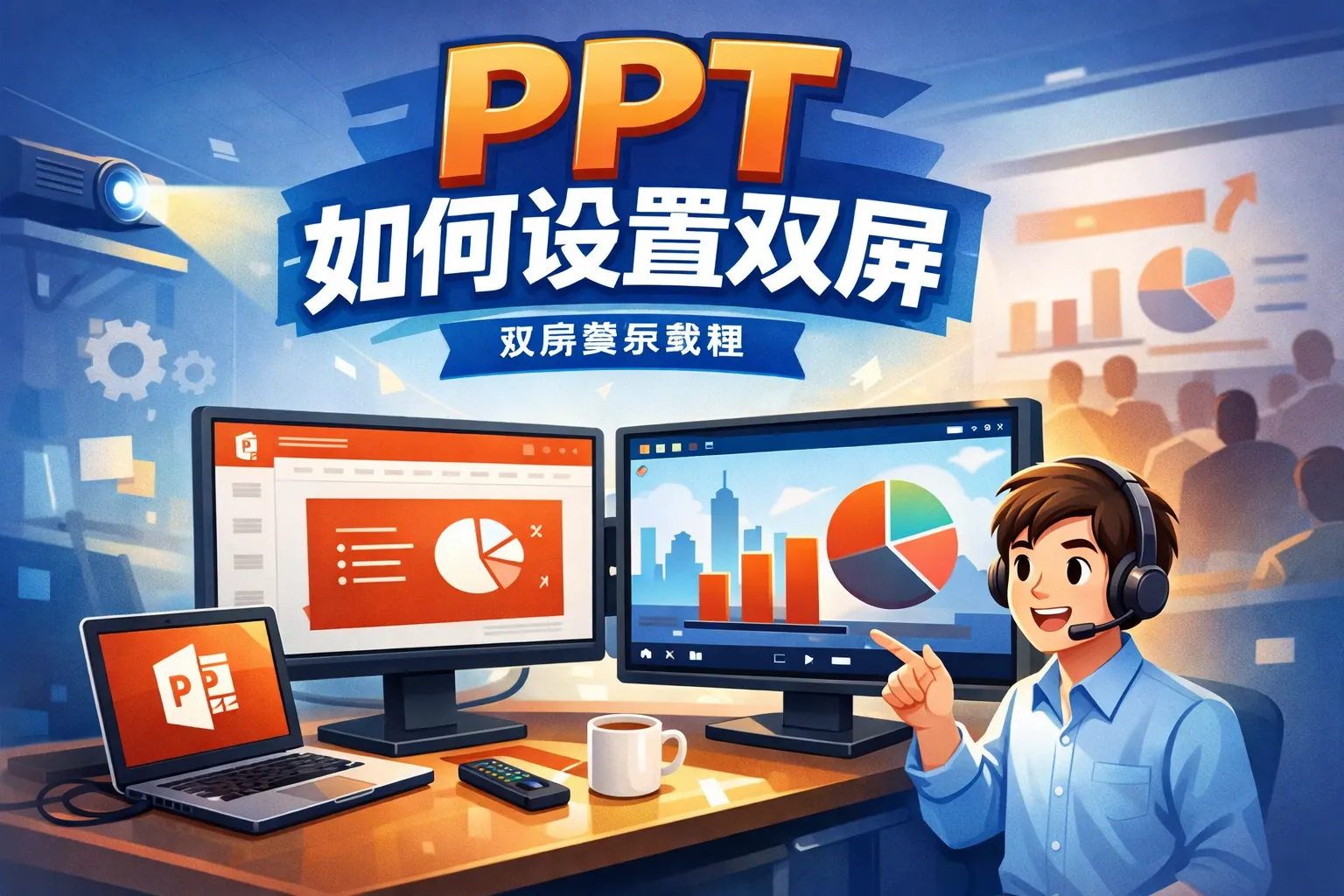 实现PPT双屏汇报的核心是将系统切换为扩展屏并启用PowerPoint的演示者视图:Windows按Win+P选“扩展”,在幻灯片放映中勾选“使用演示者视图”并指定外接屏;macOS在系统设置—显示器中选择“使用作独立显示器”,在PowerPoint/Keynote中把放映屏设为外接屏。稳定性方面,有线连接更稳更低延迟,无线投屏更灵活但依赖网络;视频/音频需提前试播并检查输出设备。通过合理设置分辨率与缩放、善用激光笔与黑屏等功能、准备线缆与应急方案,并在协作系统中制定清单与版本规范,即可在会议室、远程会议等多场景下实现稳定、专业的双屏汇报。===