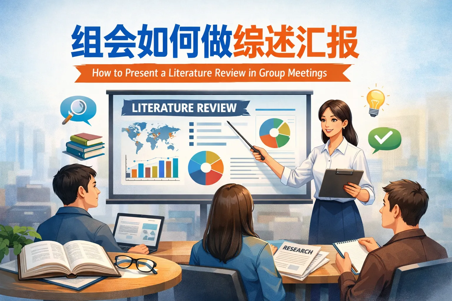 本文系统阐述组会中如何做好综述汇报:以“问题—证据—洞见—行动”为主线,先收敛选题与透明披露检索及纳排标准,再用对比表与总览图可视化证据,强调统一口径与边界声明;PPT与口头表达遵循“每页一事、先结论后证据”,并以时间管理与问答预案确保信息传达;会后以复盘和协作系统将洞见转化为行动,形成稳定的知识资产。文章结合Gartner(2024)与Elsevier(2023)观点,并提供跨学科可视化与工具对比,兼顾科学严谨与决策可执行。