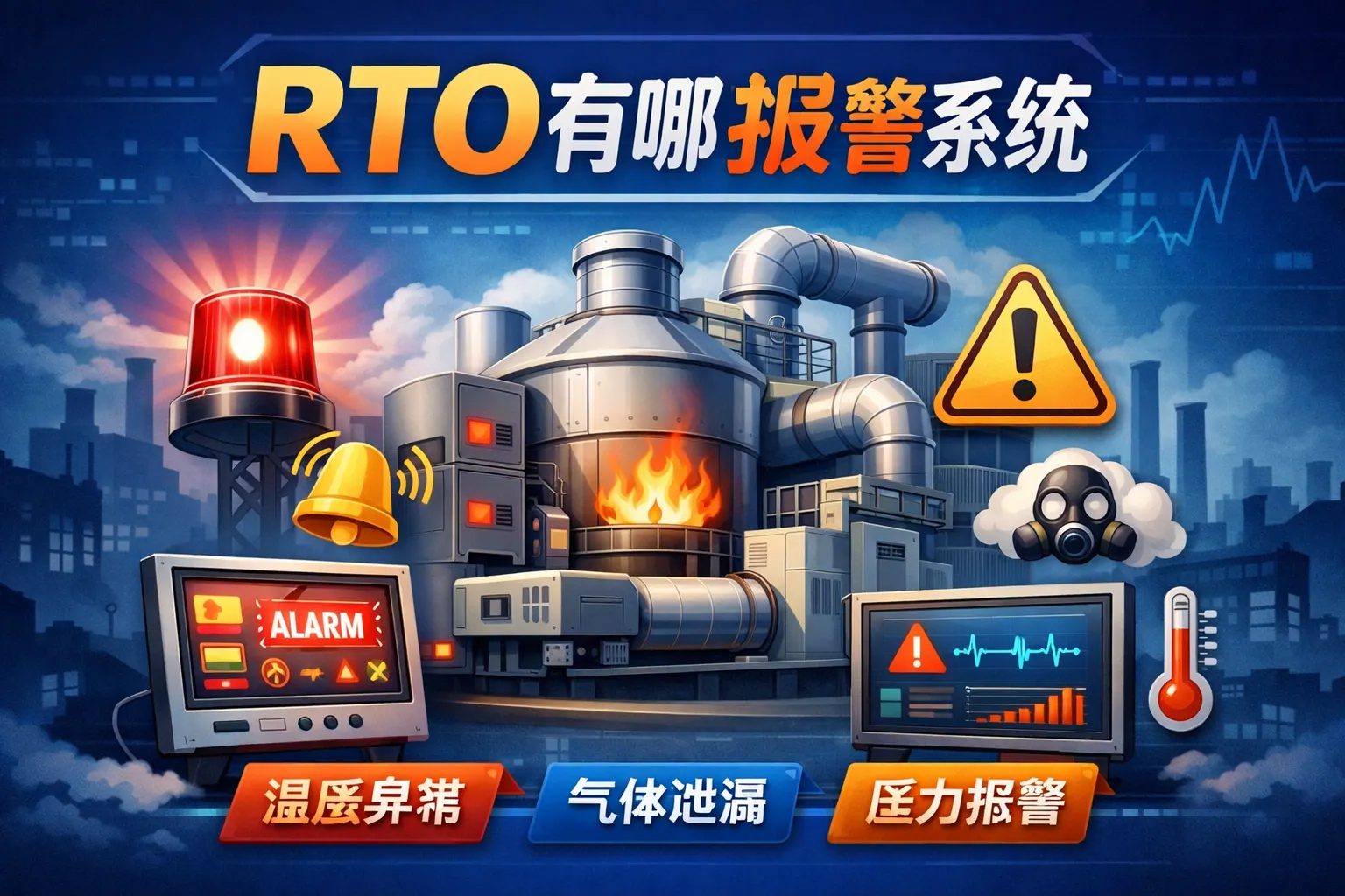 RTO报警系统主要包括温度异常、压力异常、可燃气体浓度、燃烧系统、风机故障、阀门切换、电气控制以及安全联锁等多种类型。这些报警系统通过多传感器监测与自动联锁机制,保障废气处理过程的安全性与稳定性,并满足环保与安全标准要求。随着工业智能化发展,RTO报警系统正向预测维护与数字化管理升级,提升运行可靠性与风险防控能力。