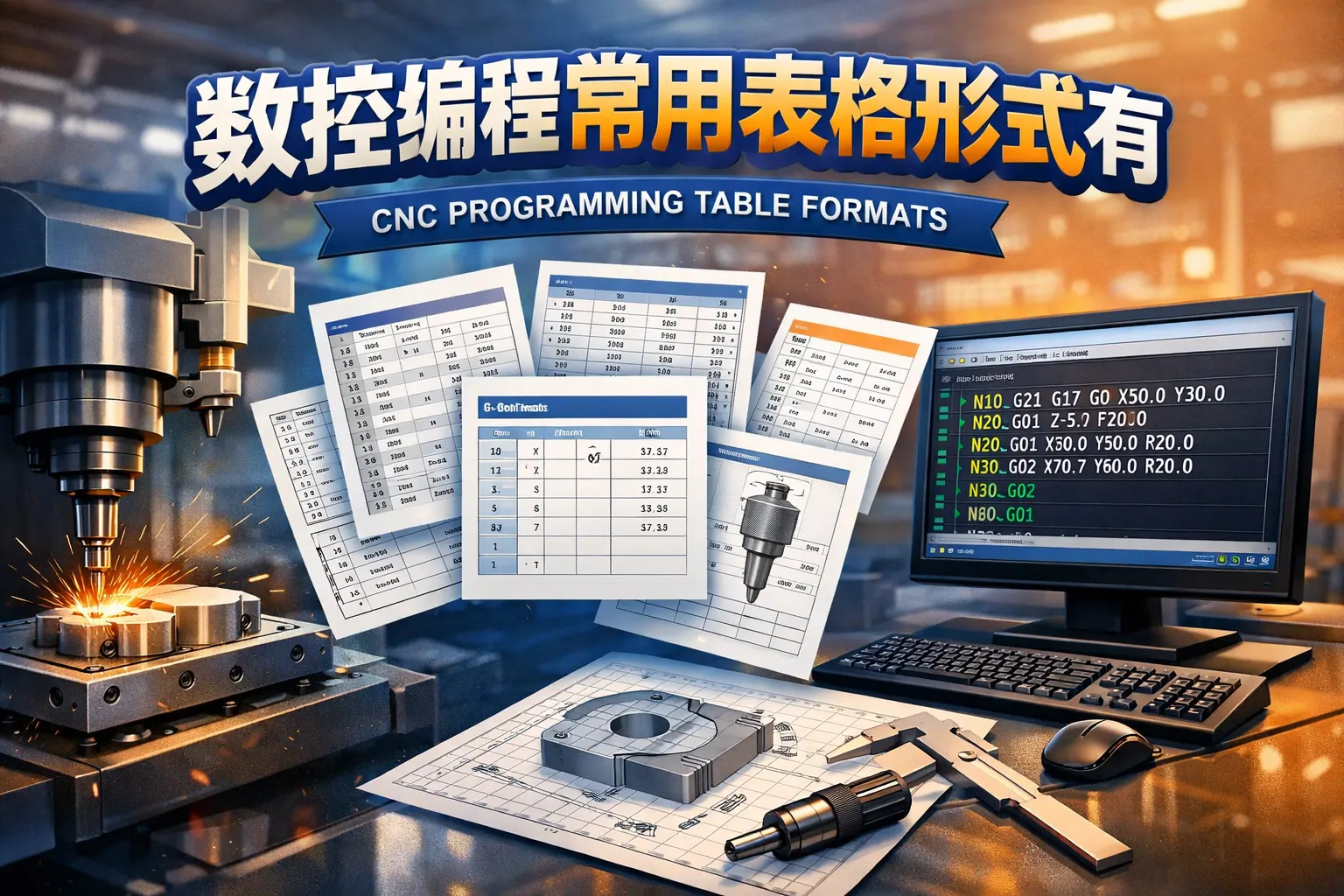 数控编程常用表格形式主要包括刀具参数表、加工工艺卡片、切削用量表、坐标基准对照表、程序结构表以及刀补管理表等,这些表格通过结构化记录加工数据,实现编程规范化、加工精度控制与效率优化。随着数字化制造发展,传统表格正向数据化与系统化演进,成为智能制造与生产协同的重要基础工具。